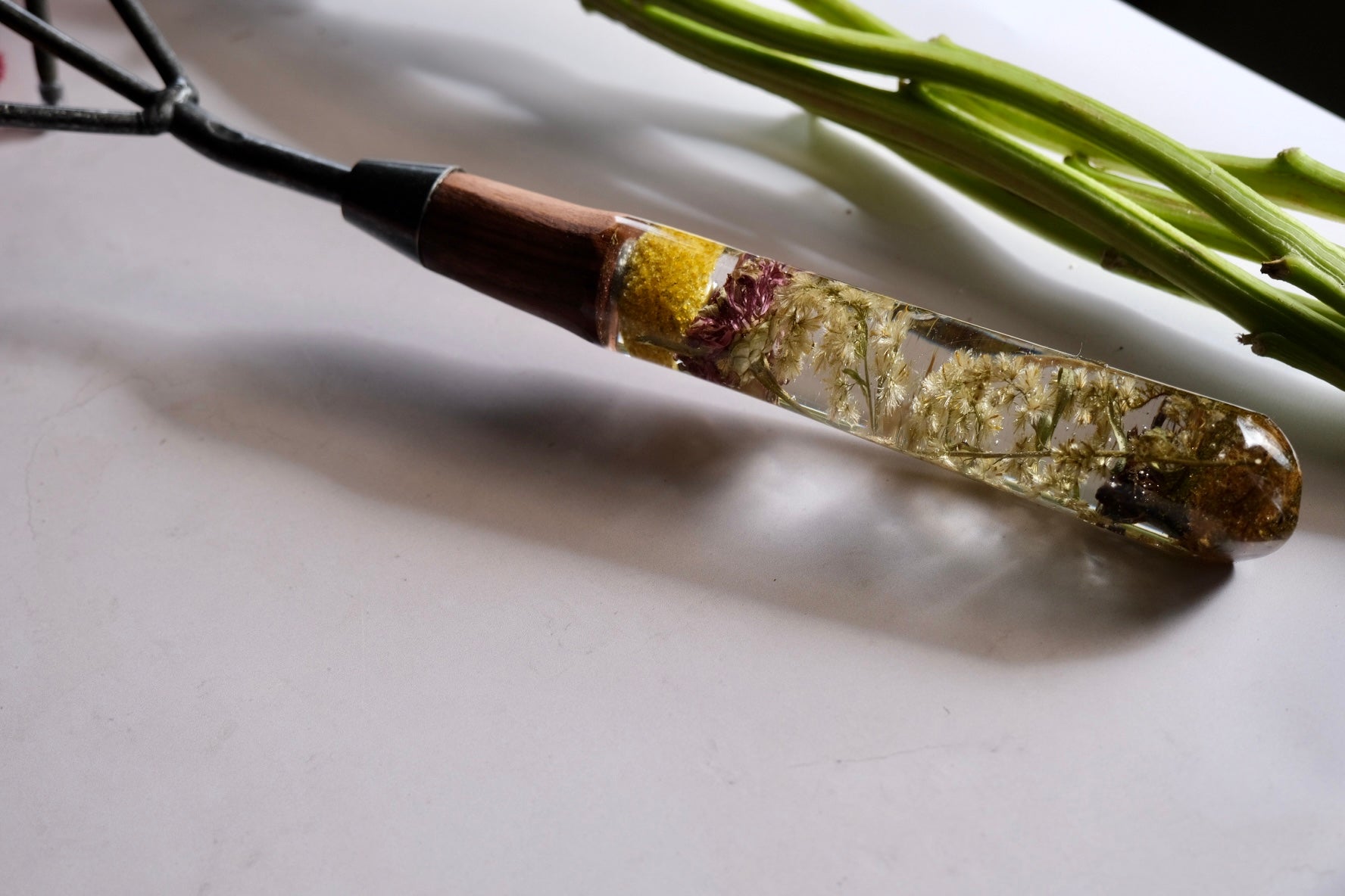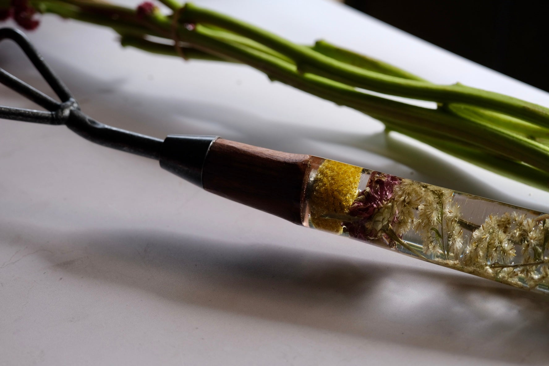 This beautiful cultivator is made with a steel top, walnut and a casted scene of billy ball, zinnia, golden rod and moss. Will come with a leather tie.