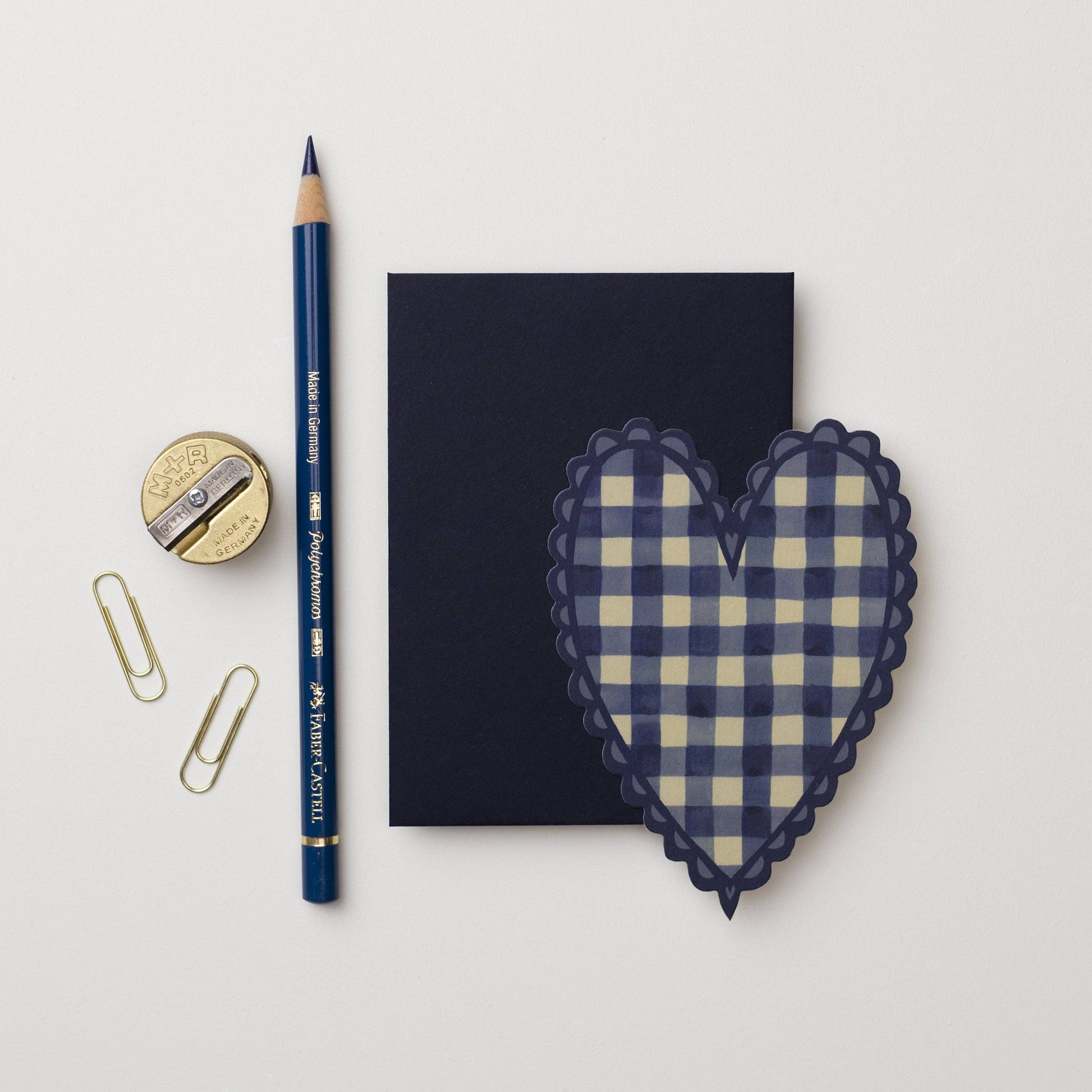 A mini die cut flat heart in a blue gingham print. Each heart is paired with a navy blue C7 envelope.