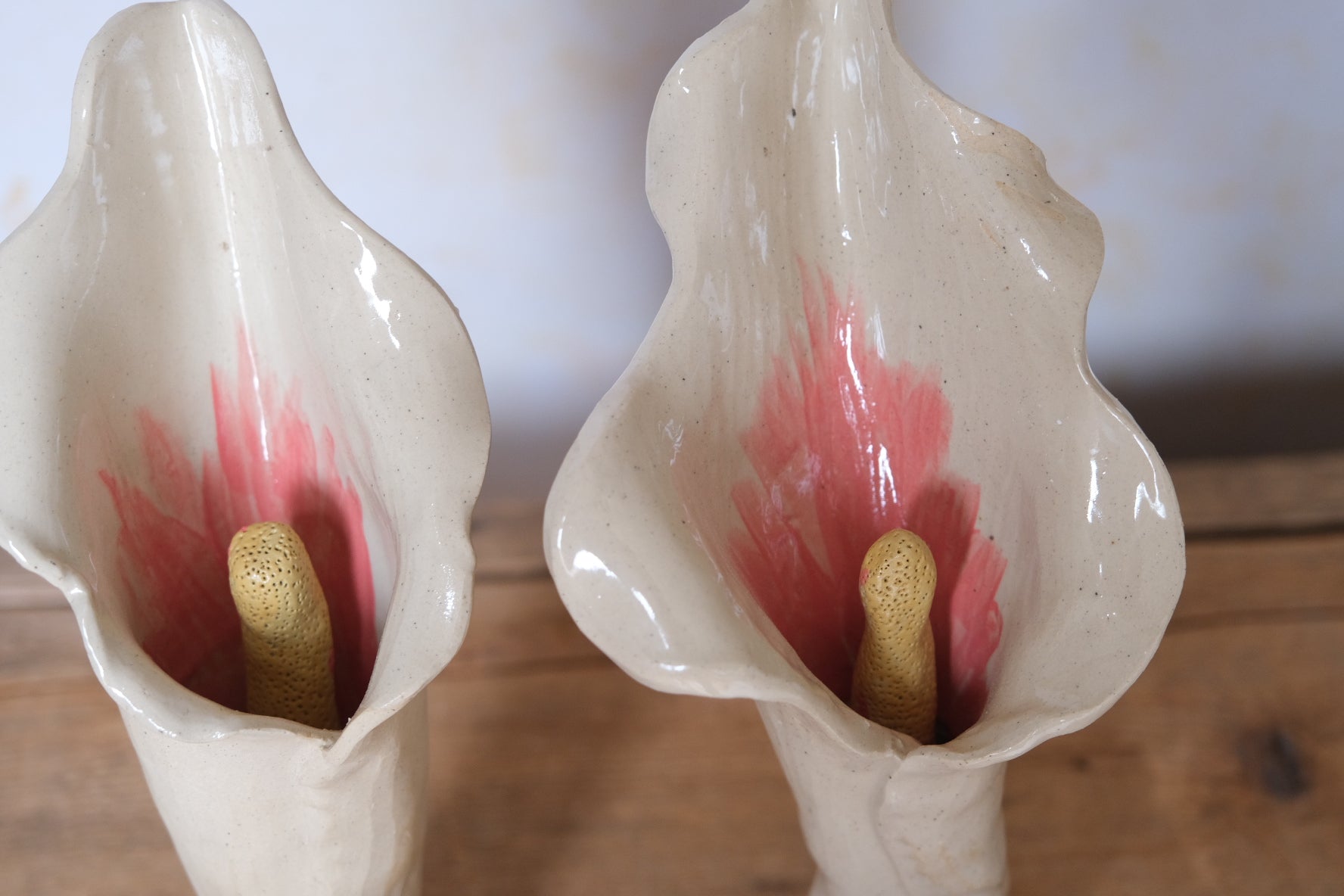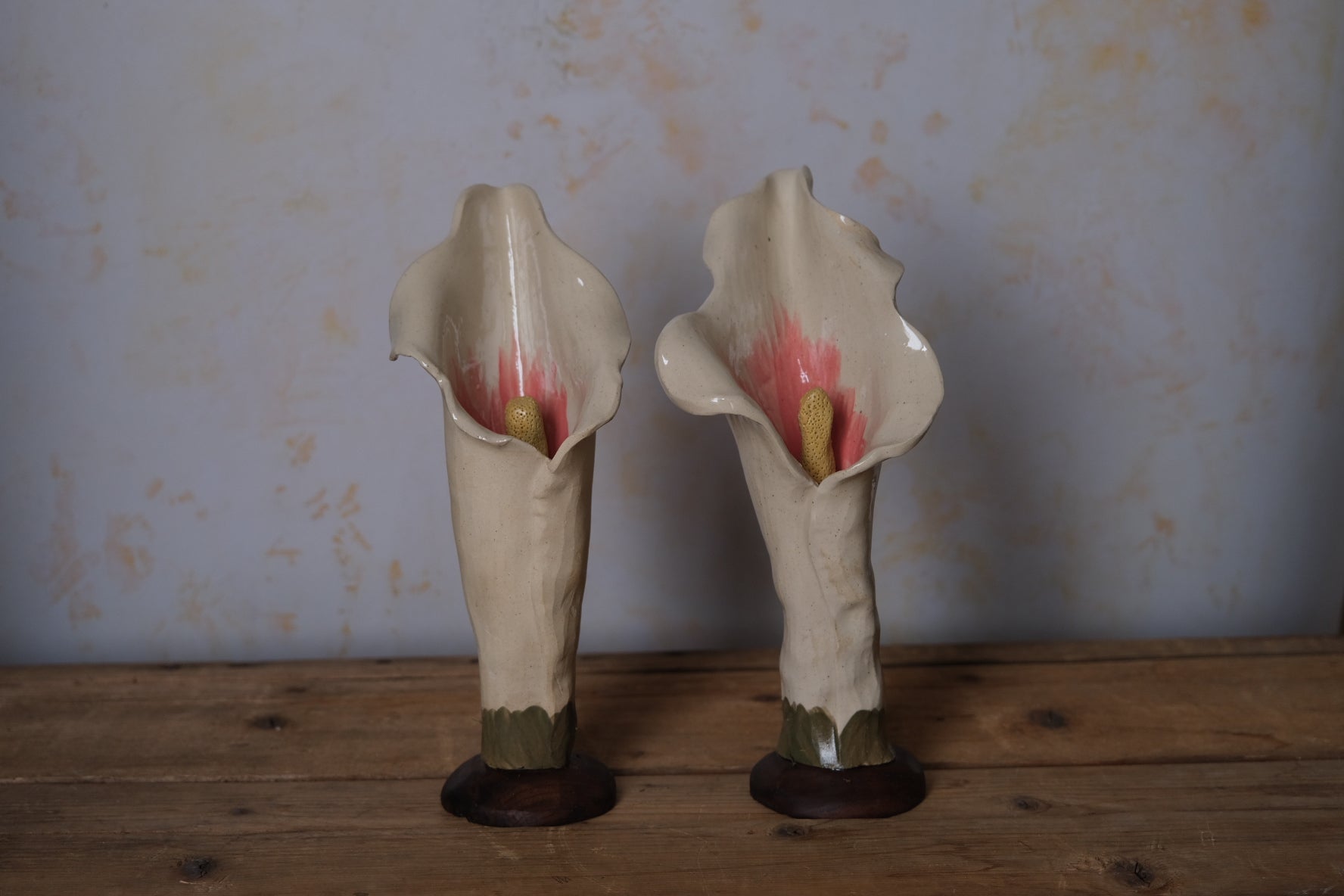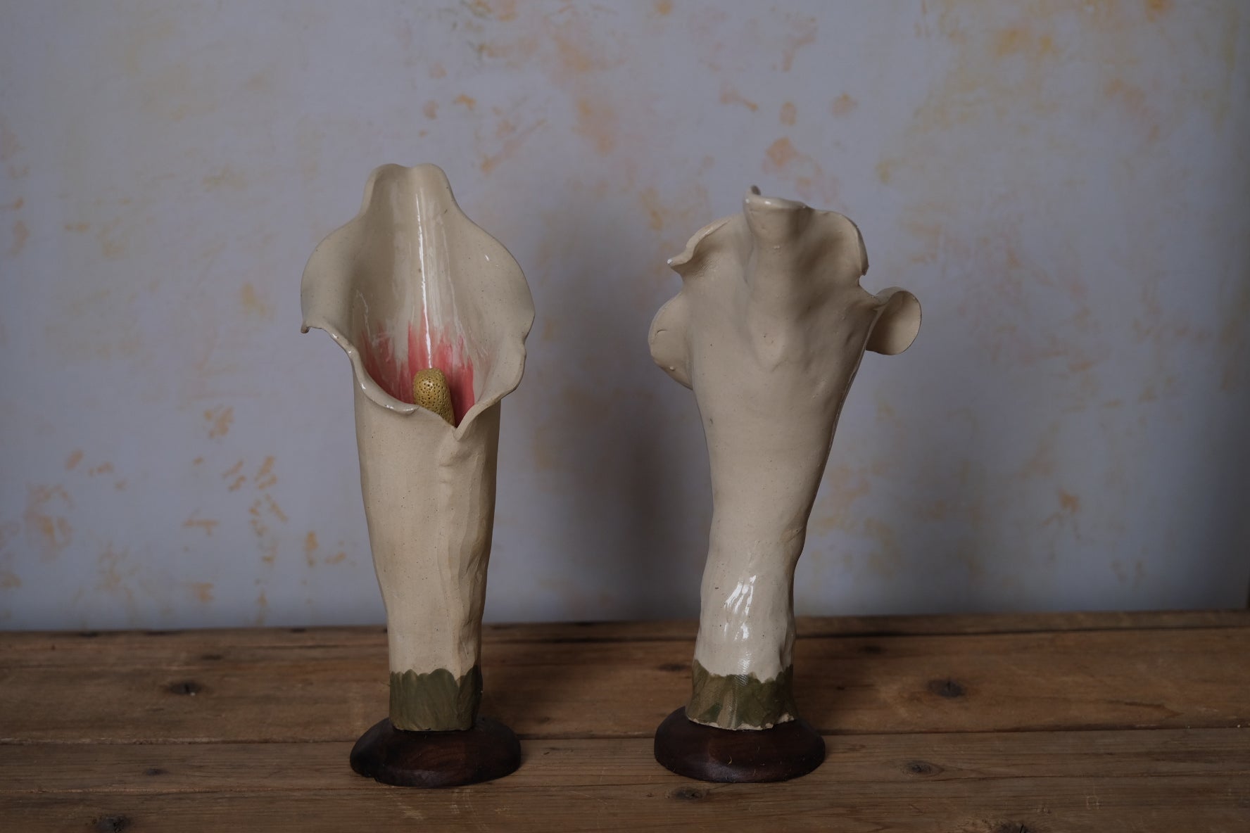 These calla lilys are hand built with walnut bases. Use as champagne flutes, water glasses, vases, sculptures, and anything else your heart can desire. Comes with a set of two.