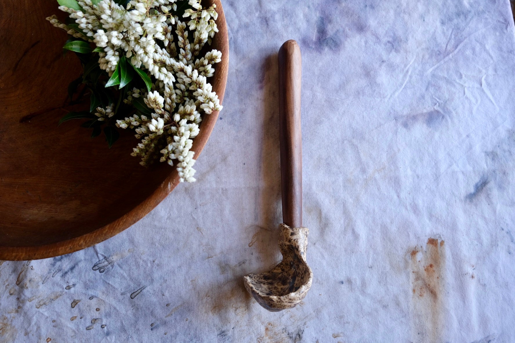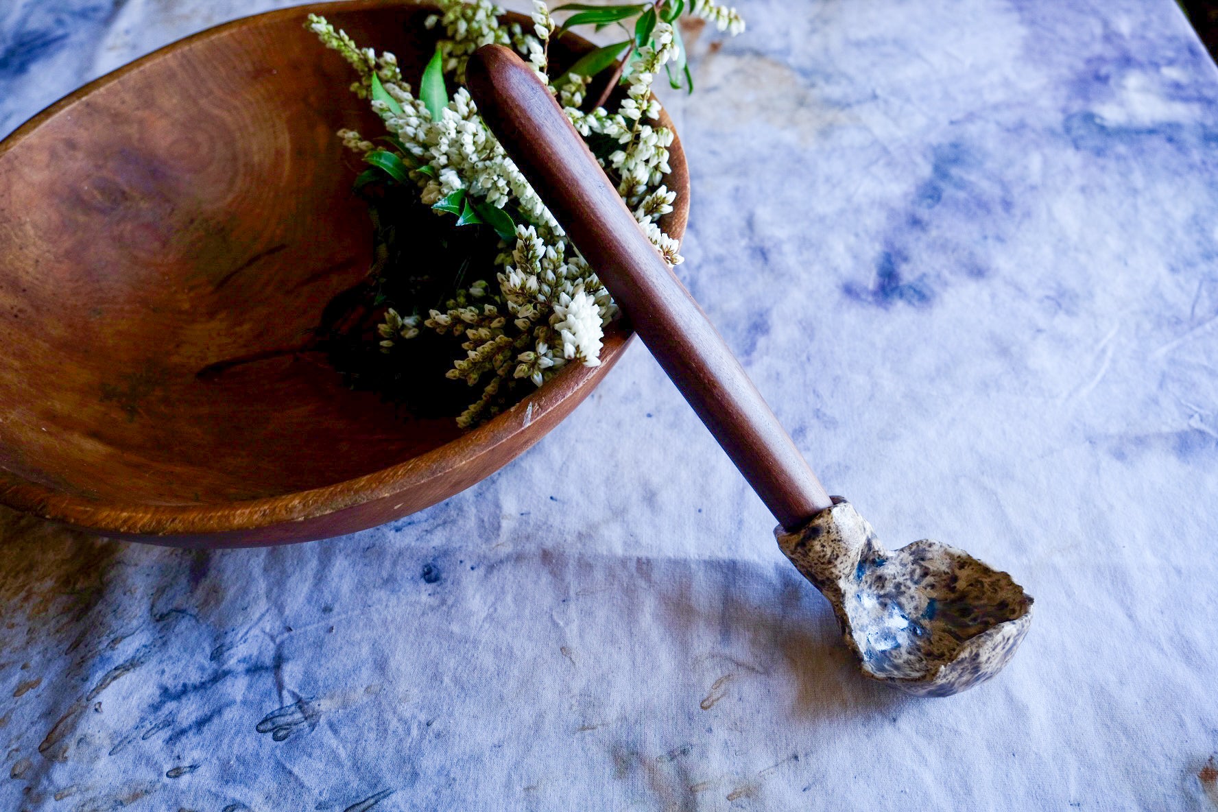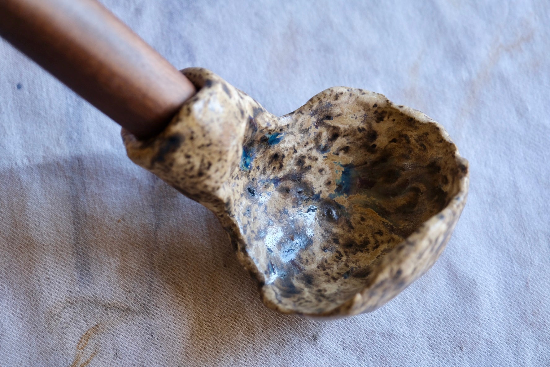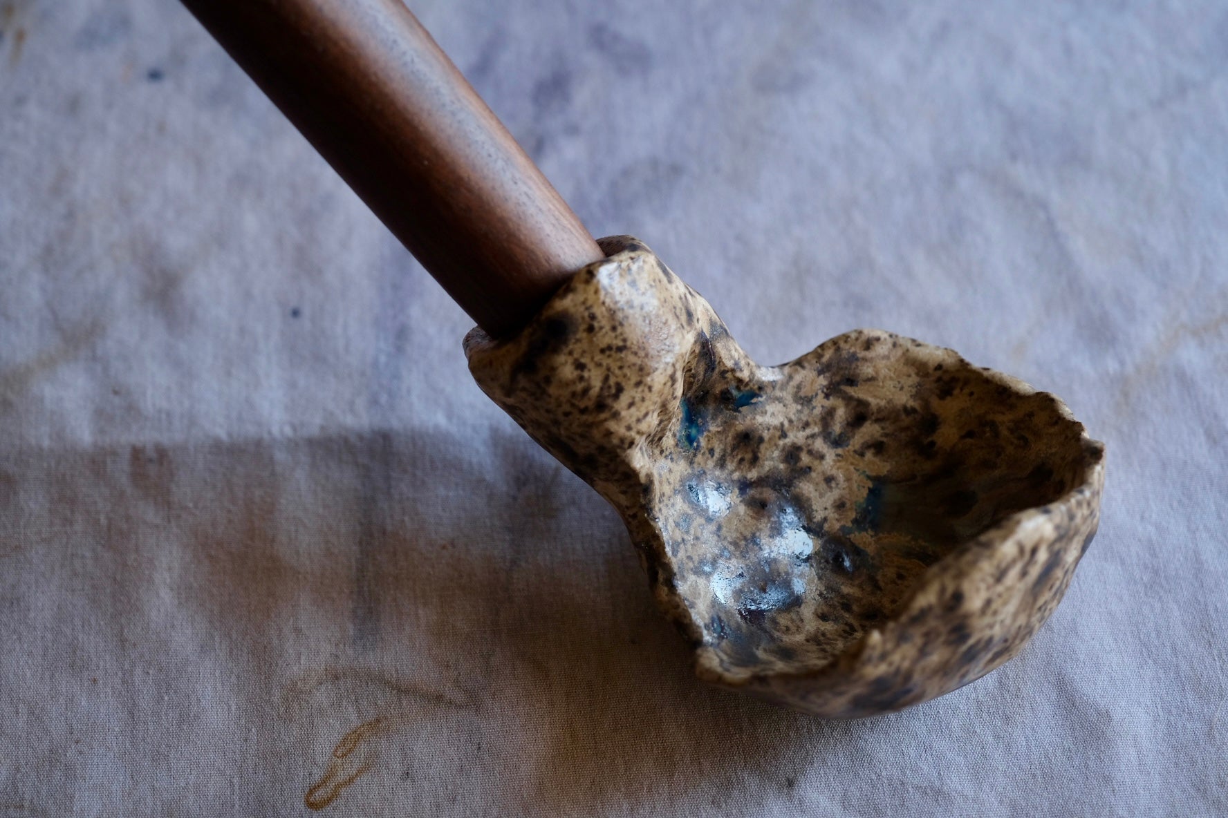 A beautiful ladle made with a walnut handle and a clay body. Glazed with speckles of browns, blacks and blues. Hand built and made for everyday. Sealed using spoon + hook wood care. Please hand wash and towel dry and re-oil as needed.