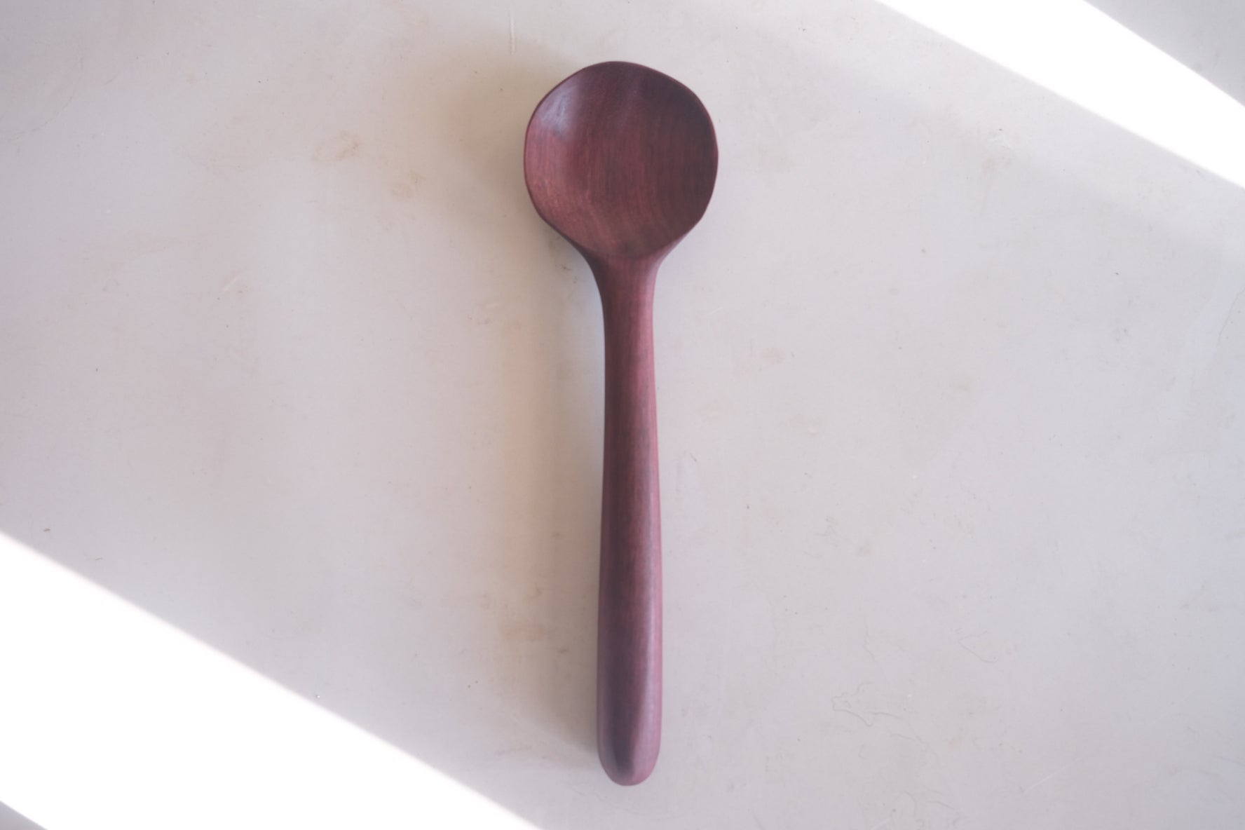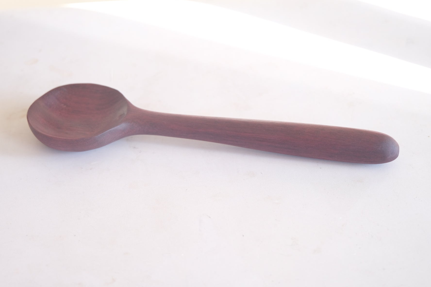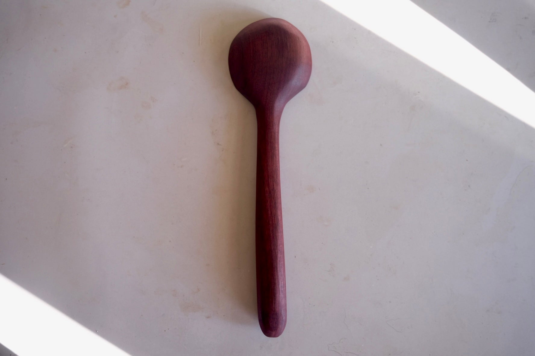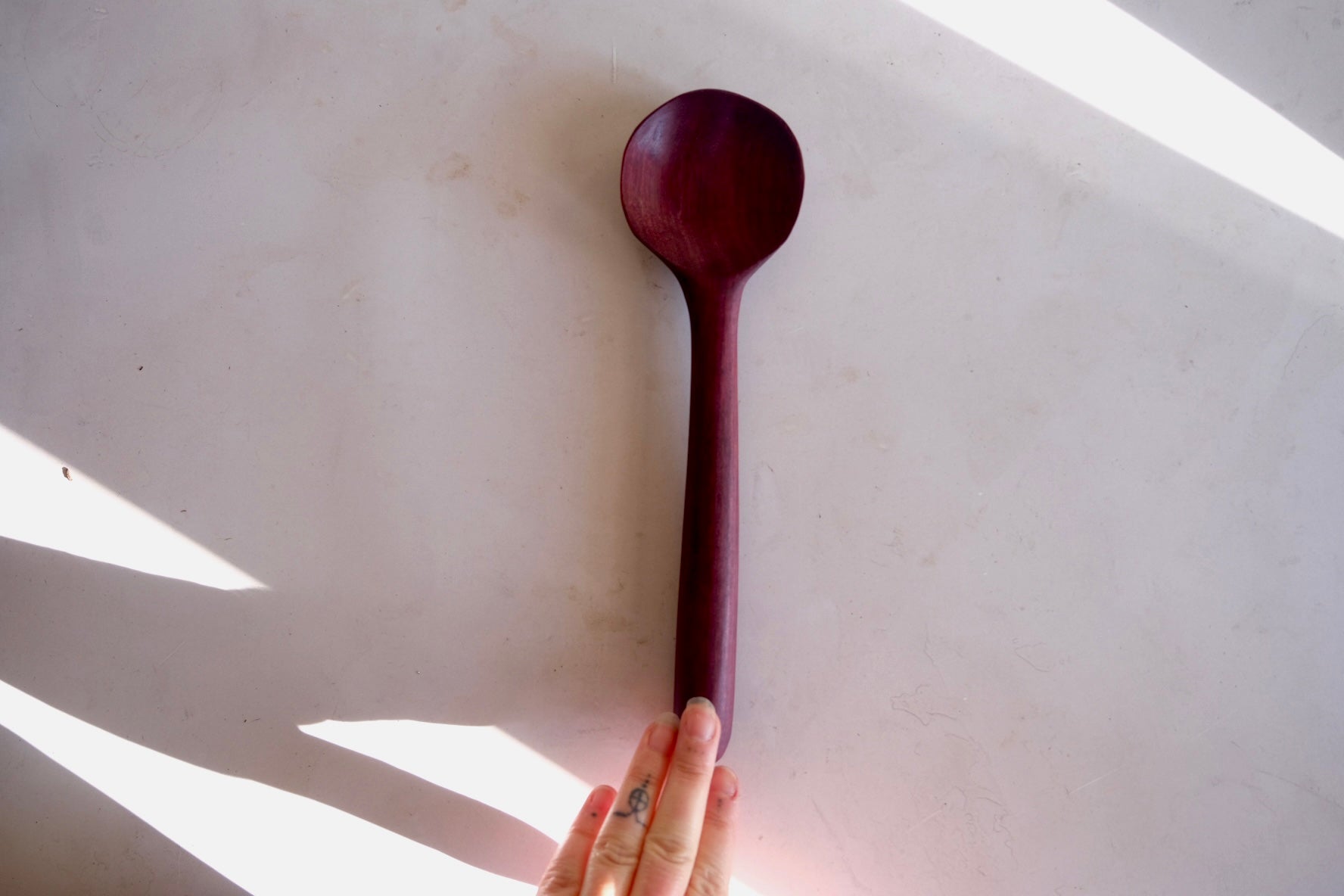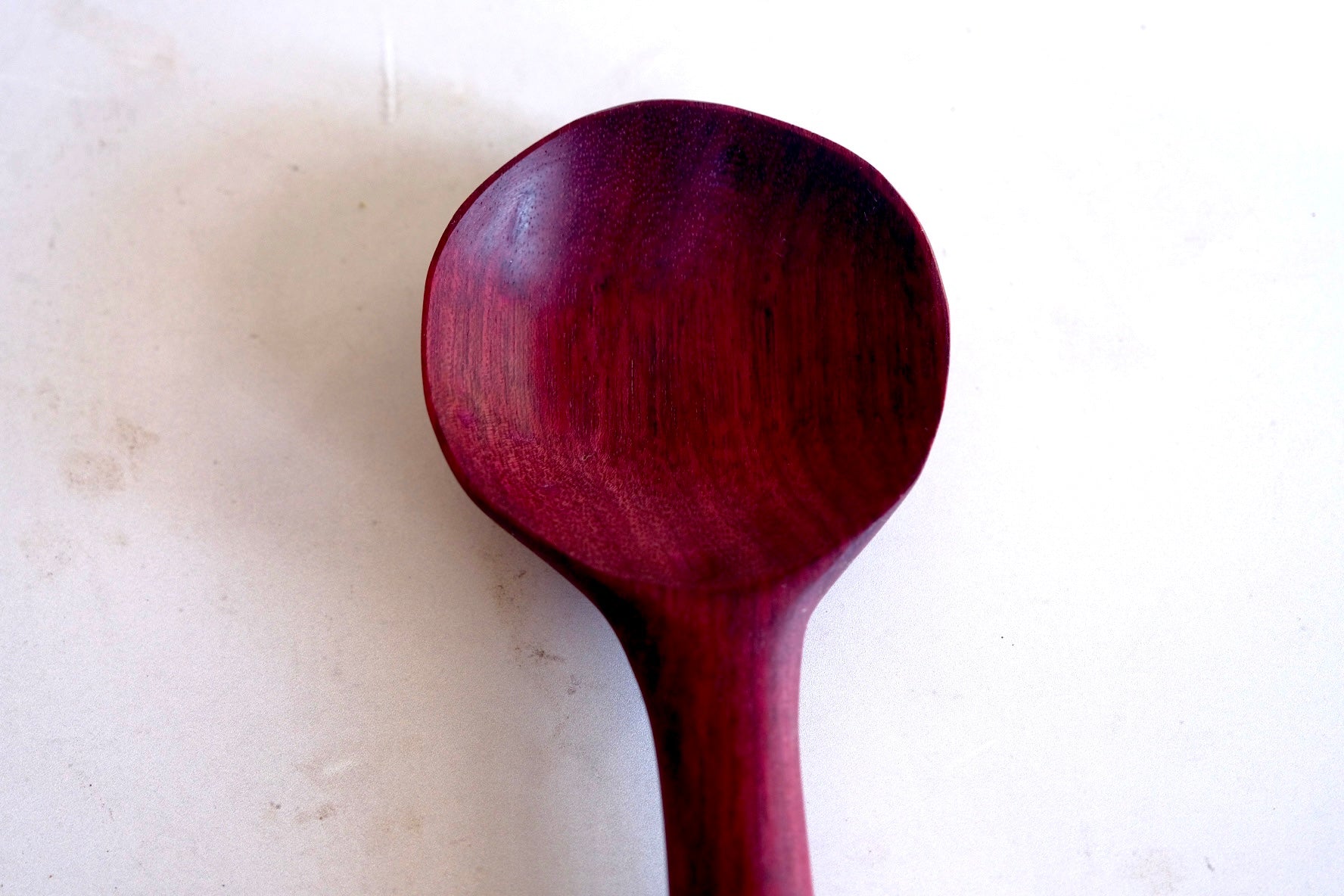 This beautiful spoon is hand carved from Purple Heart wood. The color of this wood is completely natural!!! The entire piece is sealed using spoon + hook wood care. Please hand wash and towel dry and re-oil as needed.