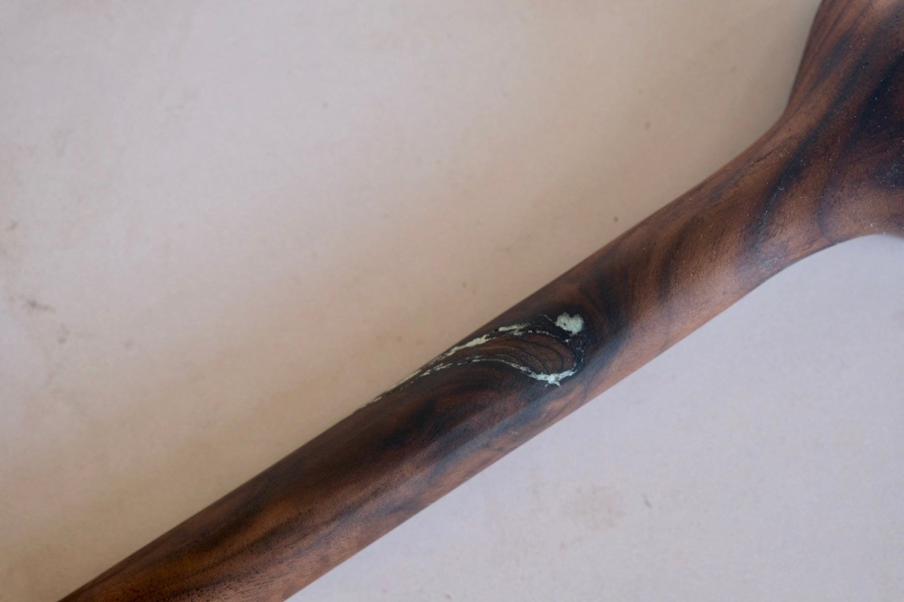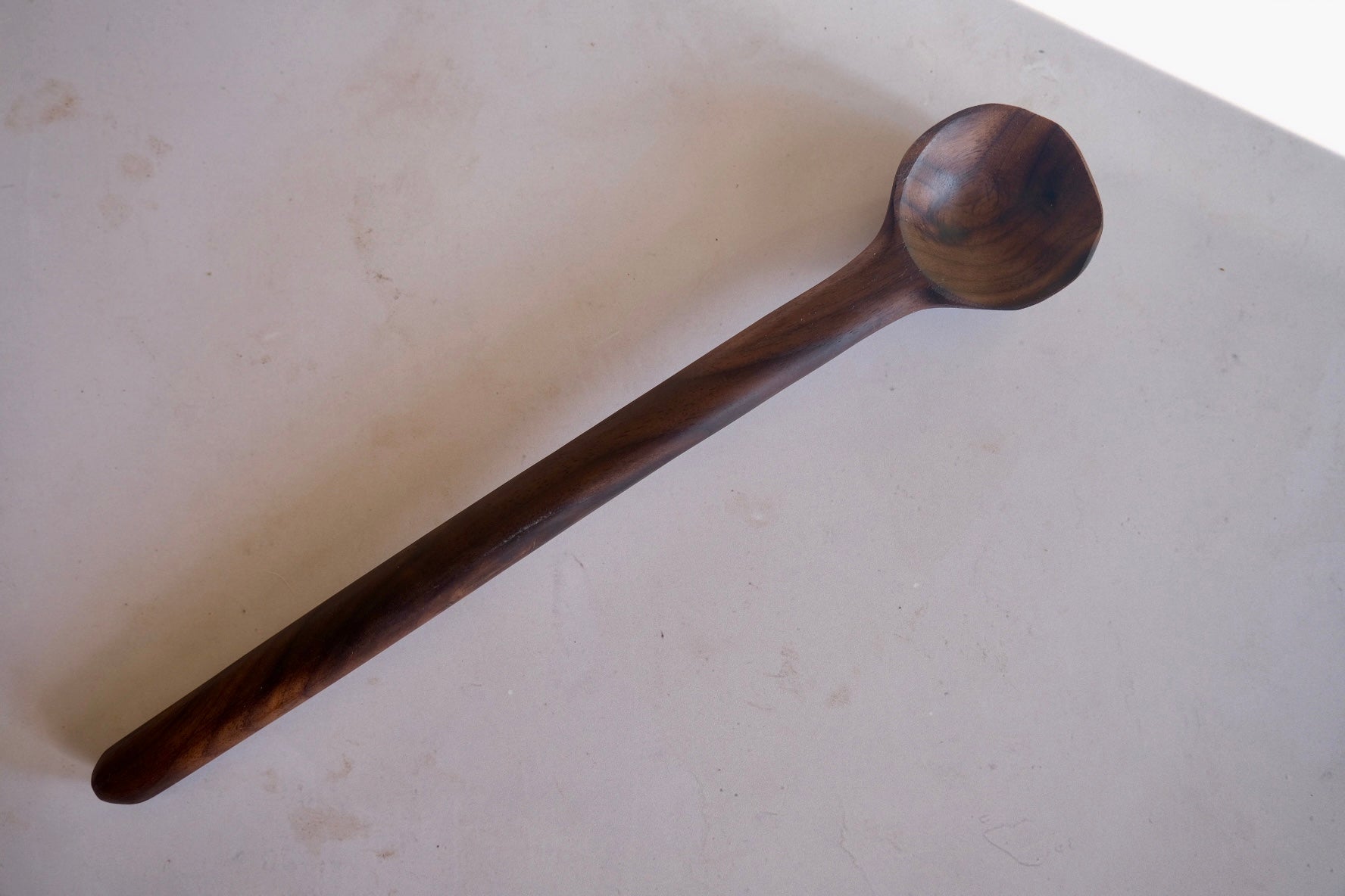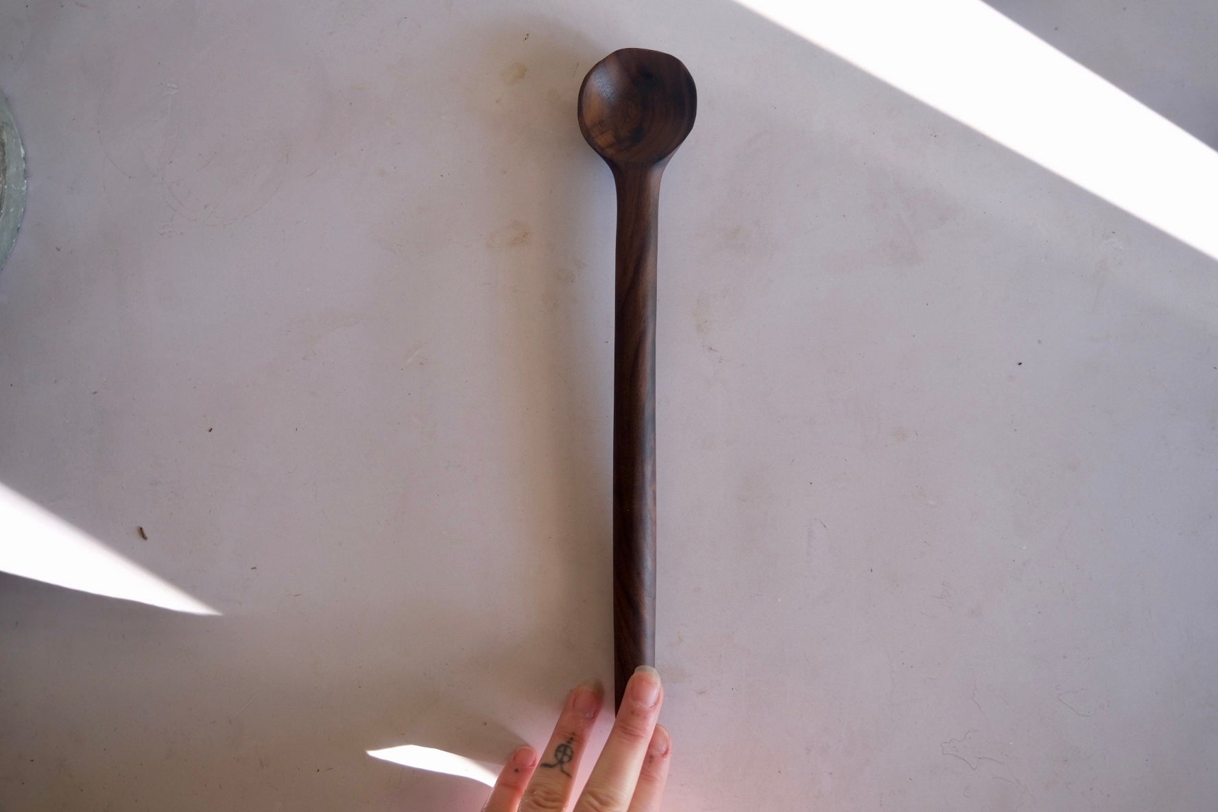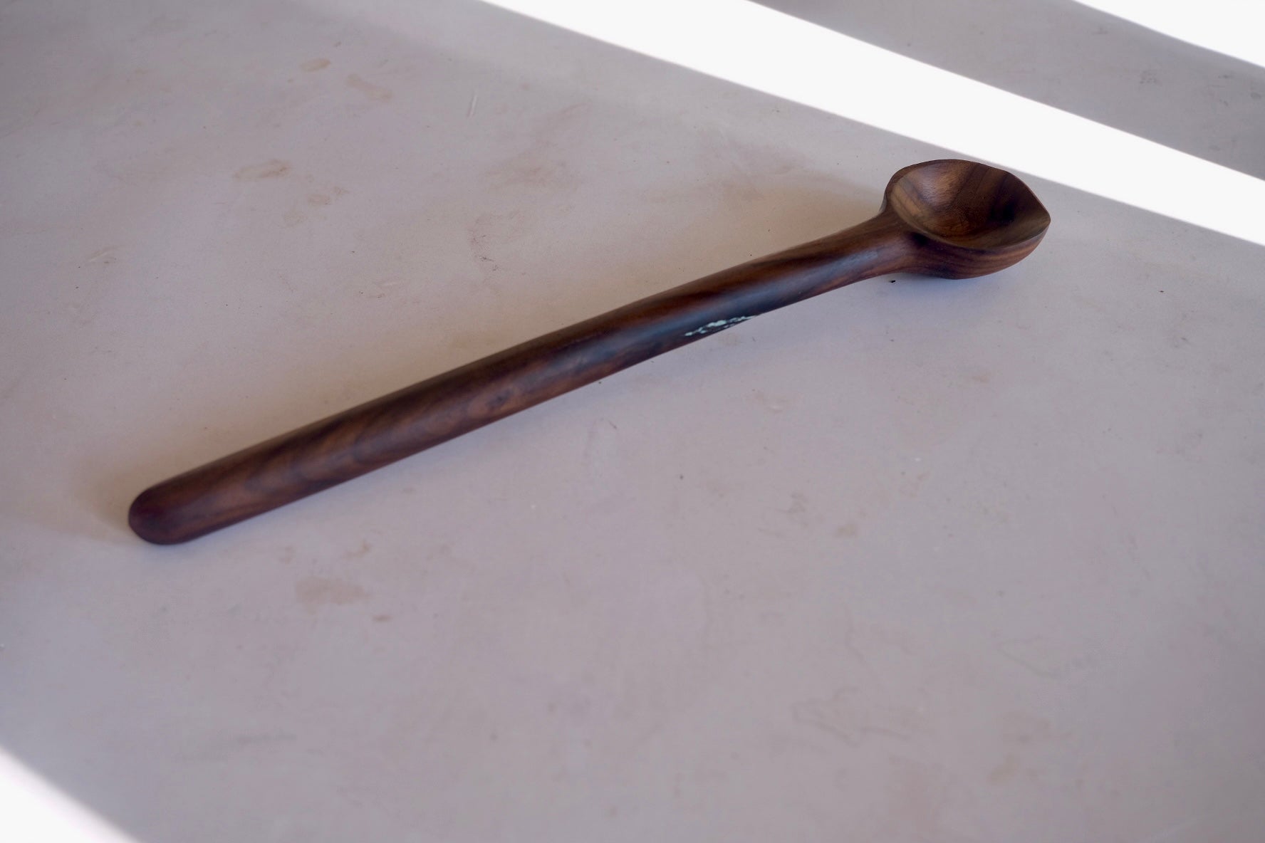 This beautiful spoon is hand carved from walnut wood with turquoise stone inlayed into the imperfections. The entire piece is sealed using spoon + hook wood care. Please hand wash and towel dry and re-oil as needed.