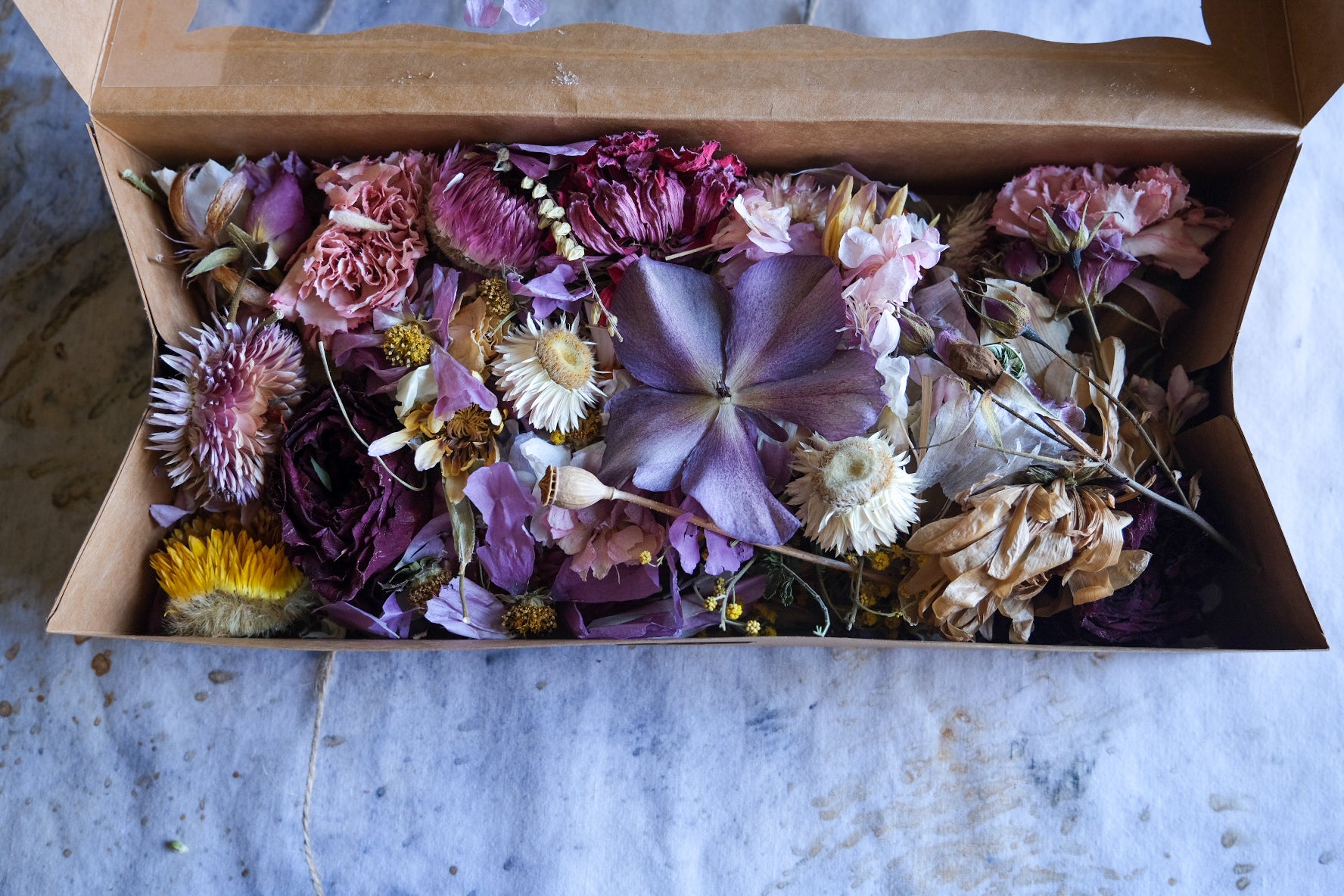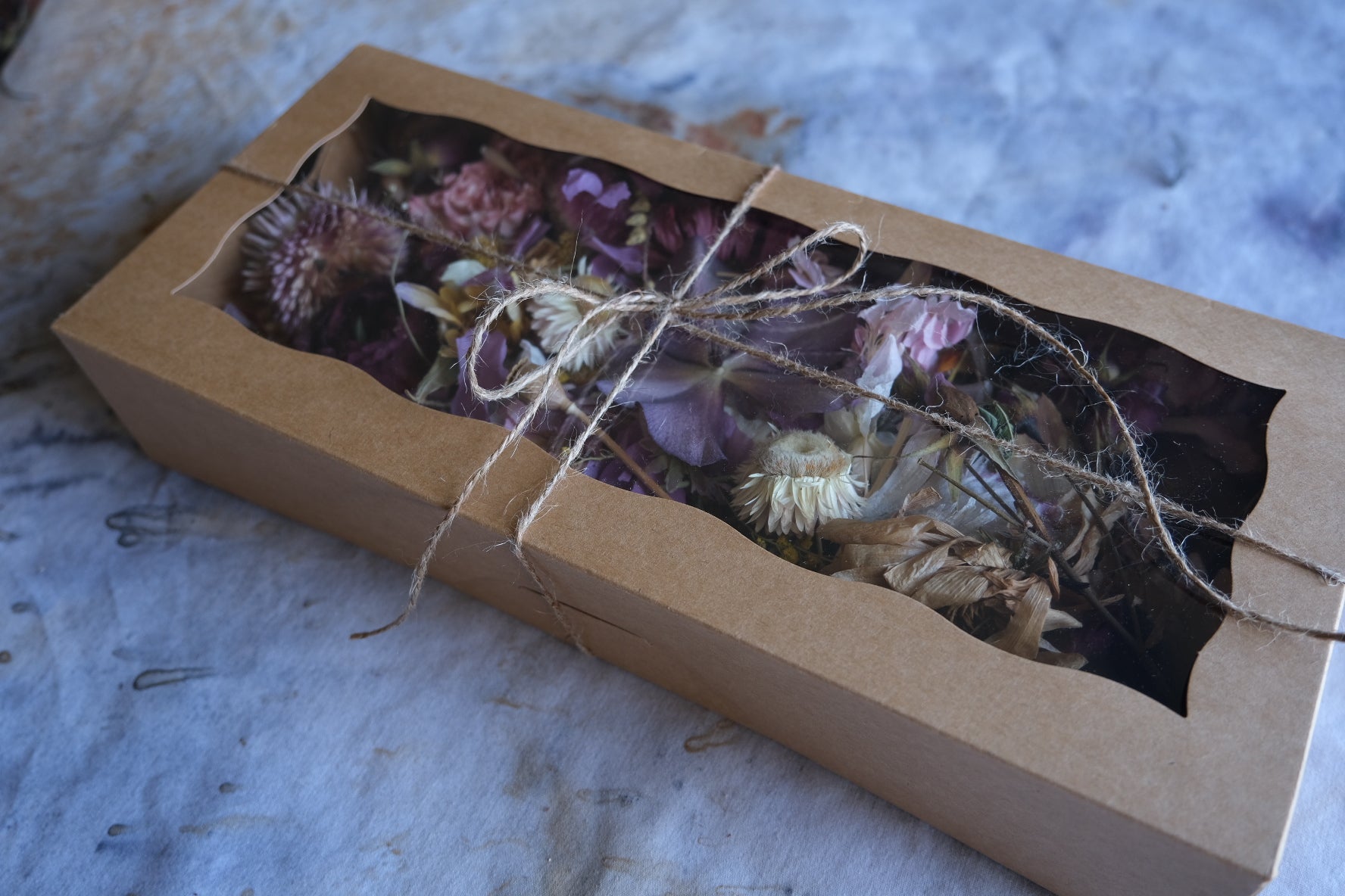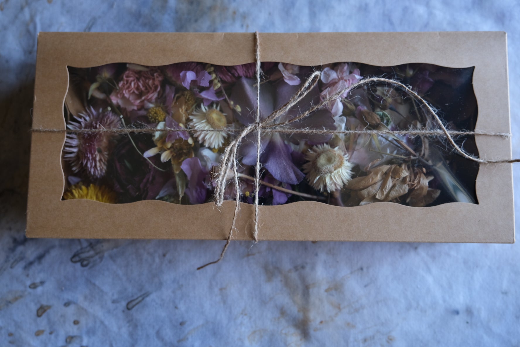 This is a box of over 60 completely dried flowers in full form and petals. These are meant to be decorative on a table, alter, picnic, or used in work. They’re dried using hanging methods as well as silica meaning they’re NOT edible. Very beautiful blooms in a graft box with twine bow.