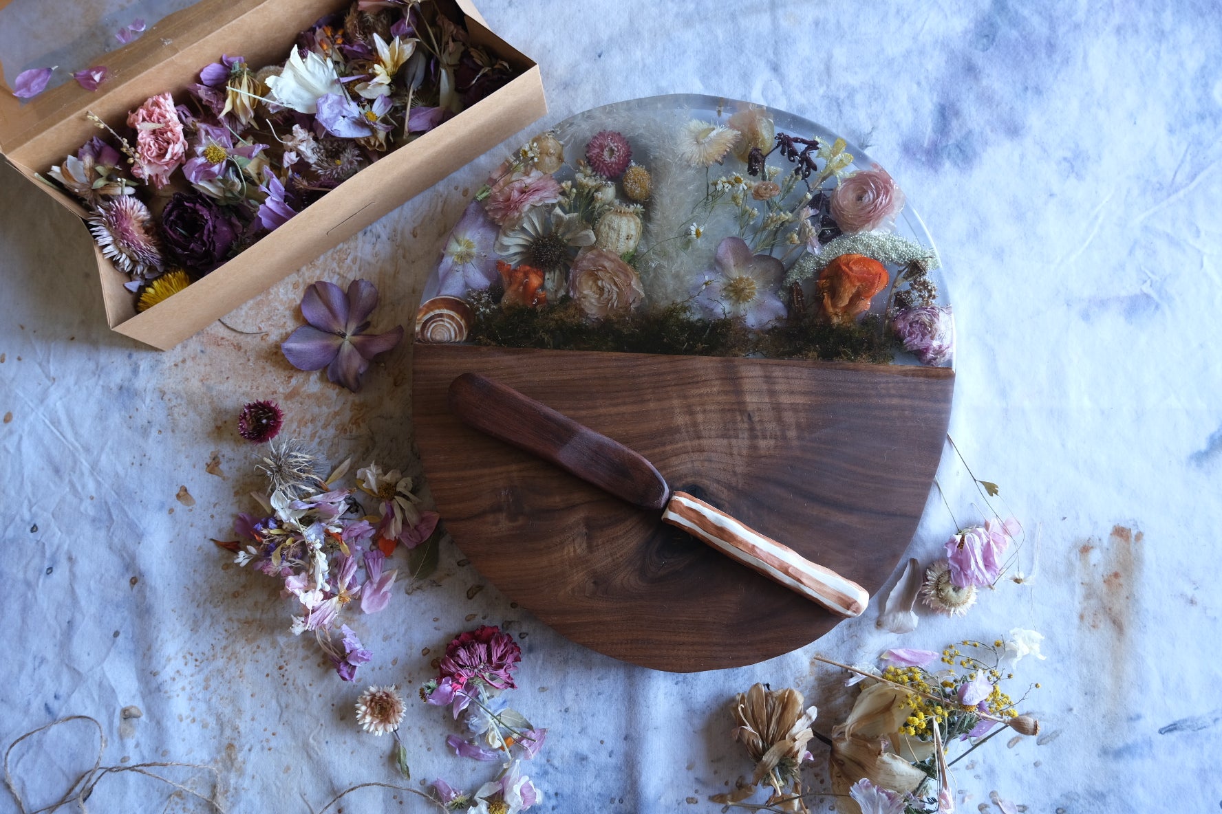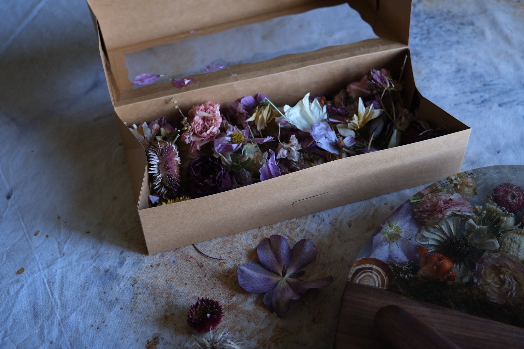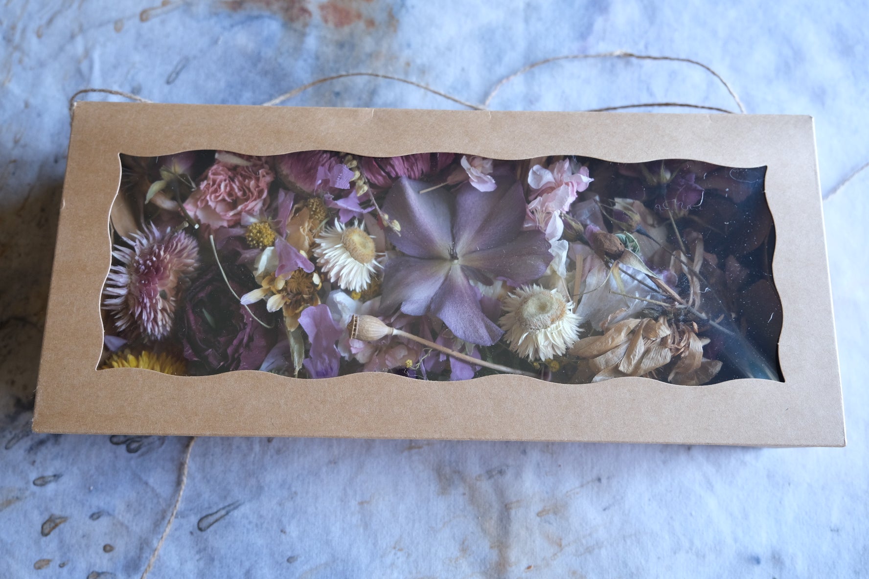 This is a box of over 60 completely dried flowers in full form and petals. These are meant to be decorative on a table, alter, picnic, or used in work. They’re dried using hanging methods as well as silica meaning they’re NOT edible. Very beautiful blooms in a graft box with twine bow.