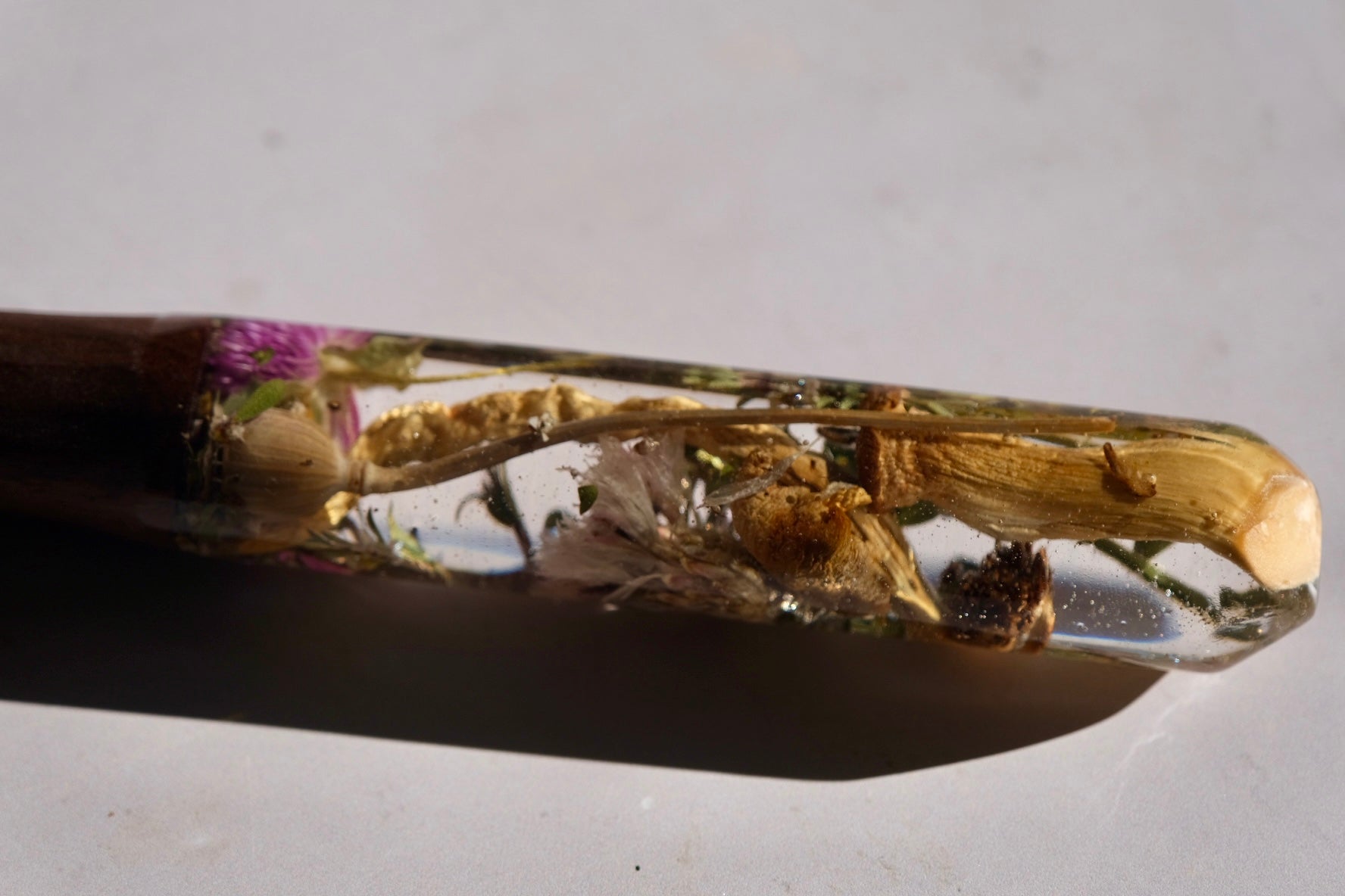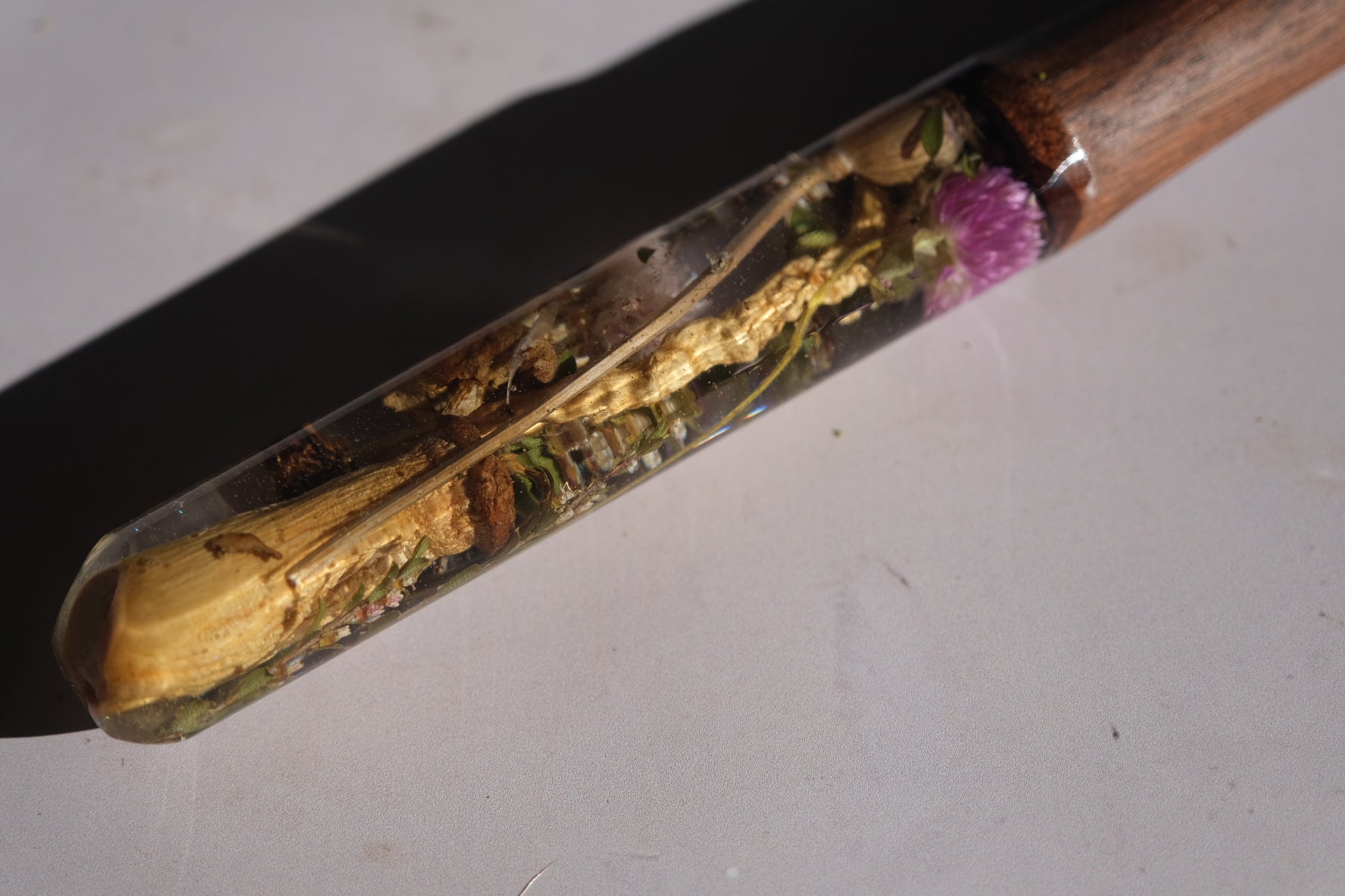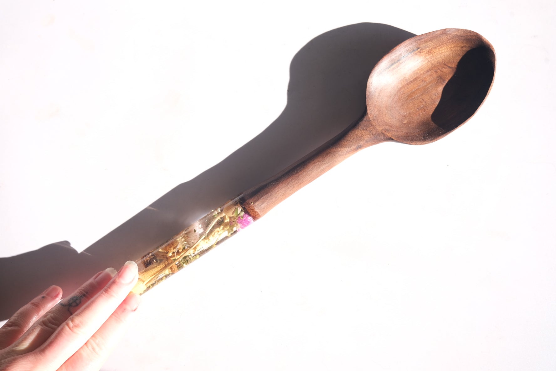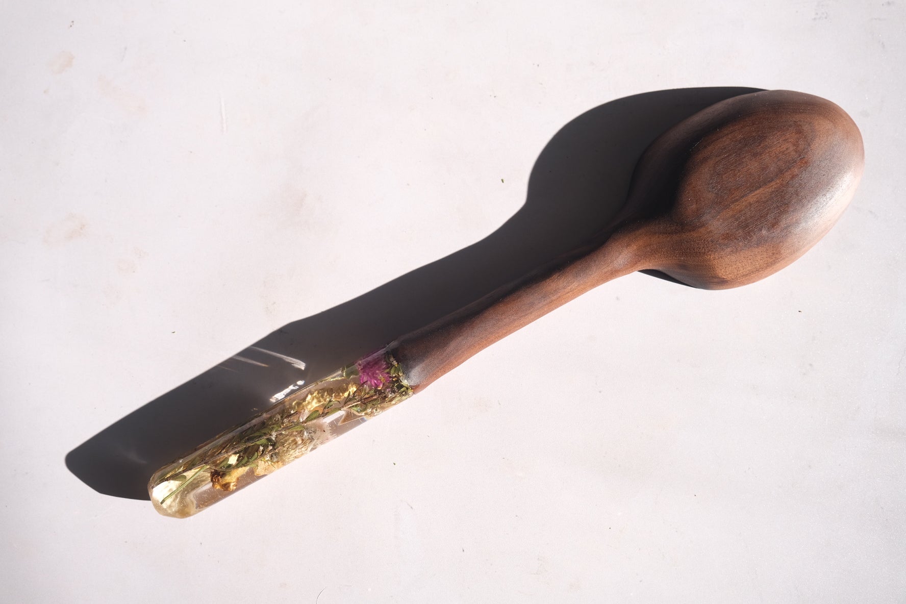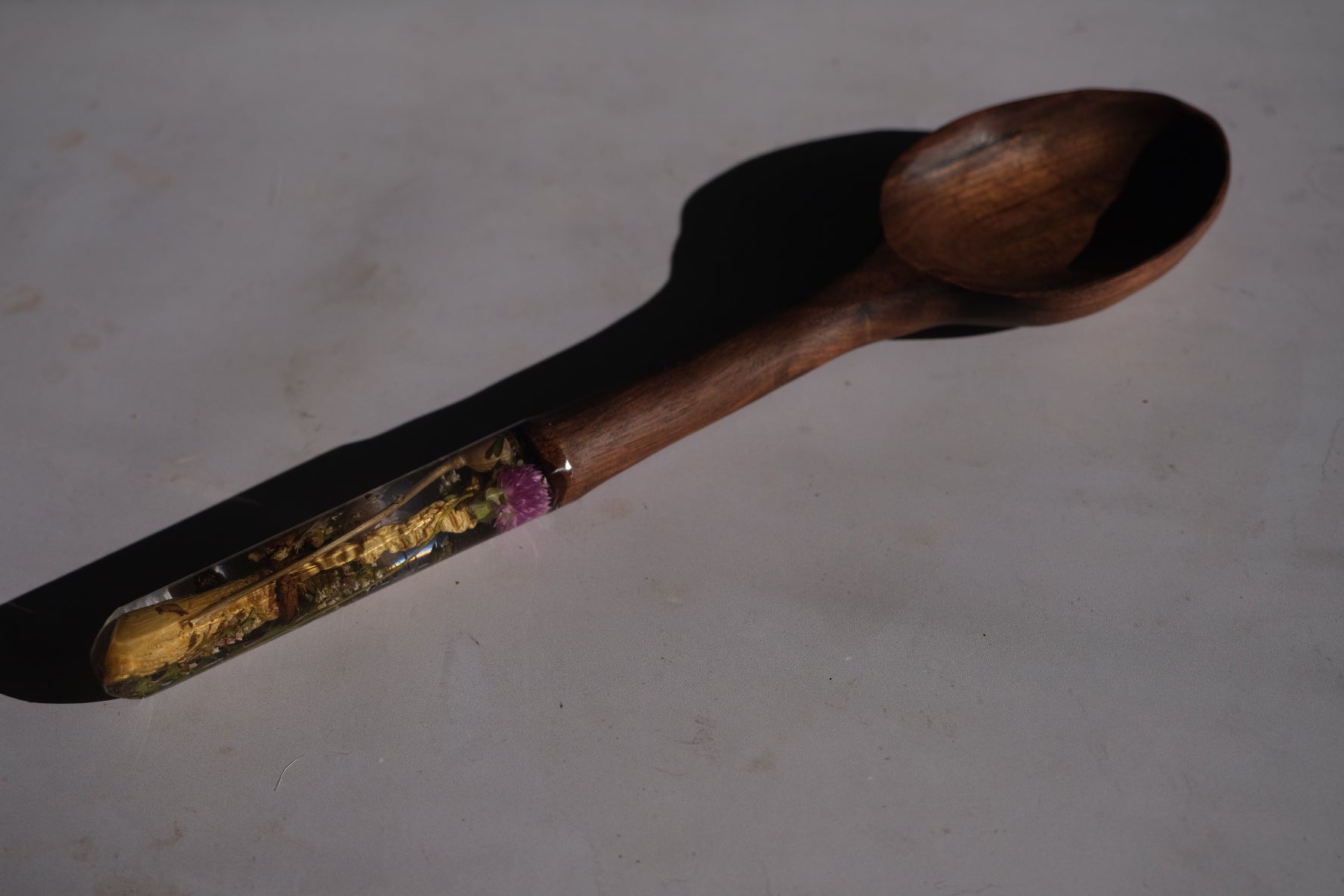 This beautiful spoon is made from walnut wood with a casted scene of poppy pod, king oyster mushroom, gomphrena, cornflower and more. The entire piece is sealed using spoon + hook wood care. Please hand wash and towel dry and re-oil as needed.