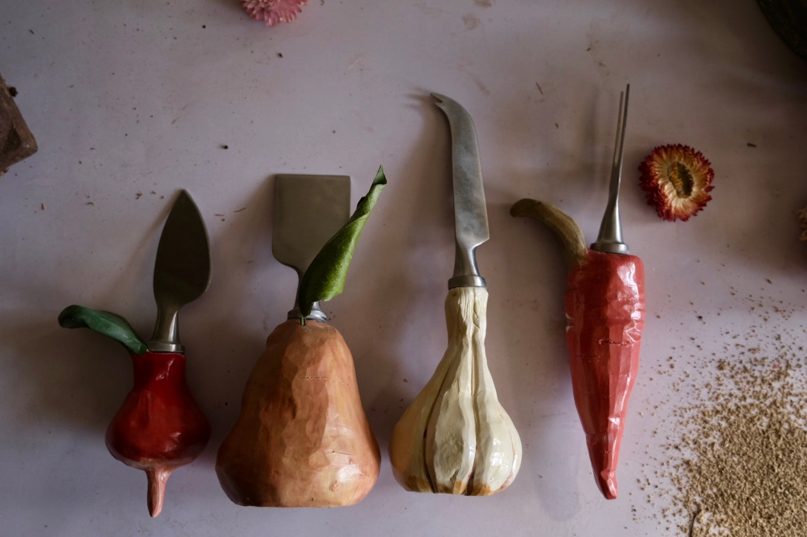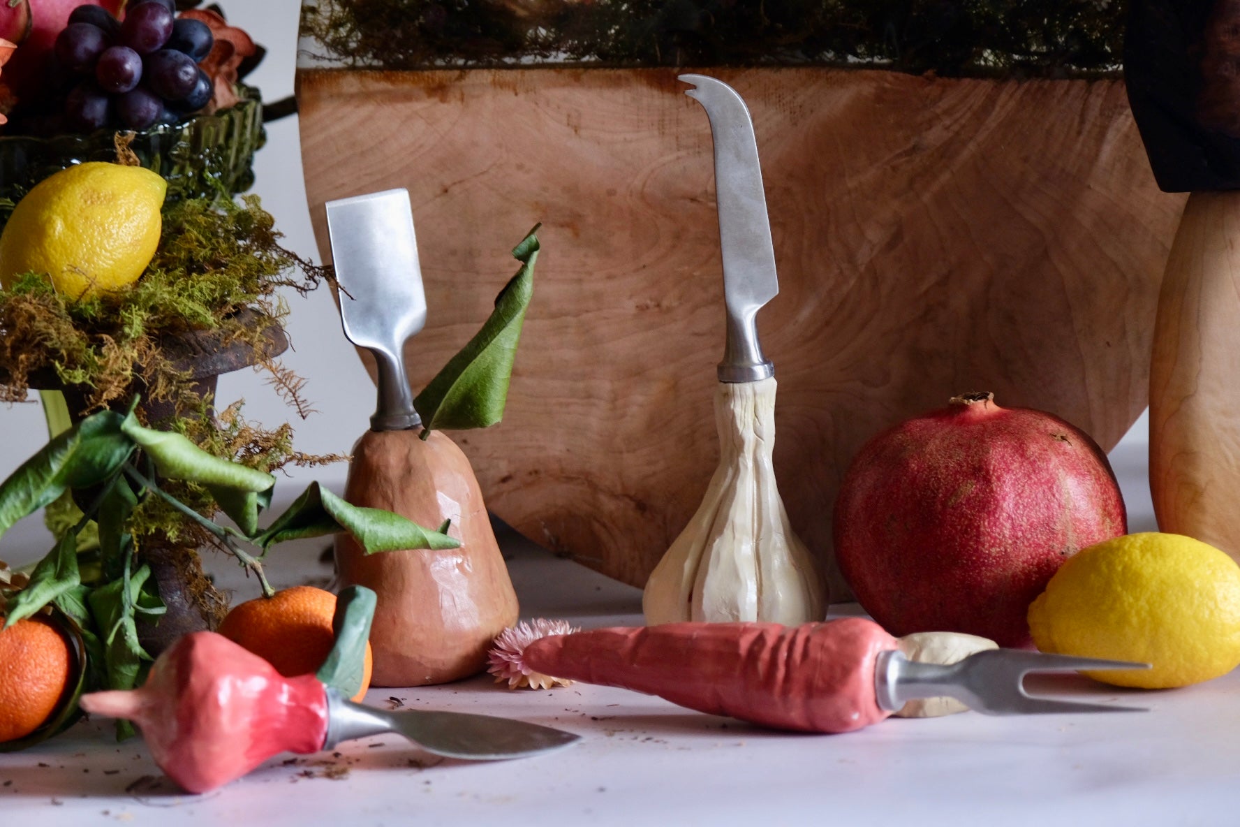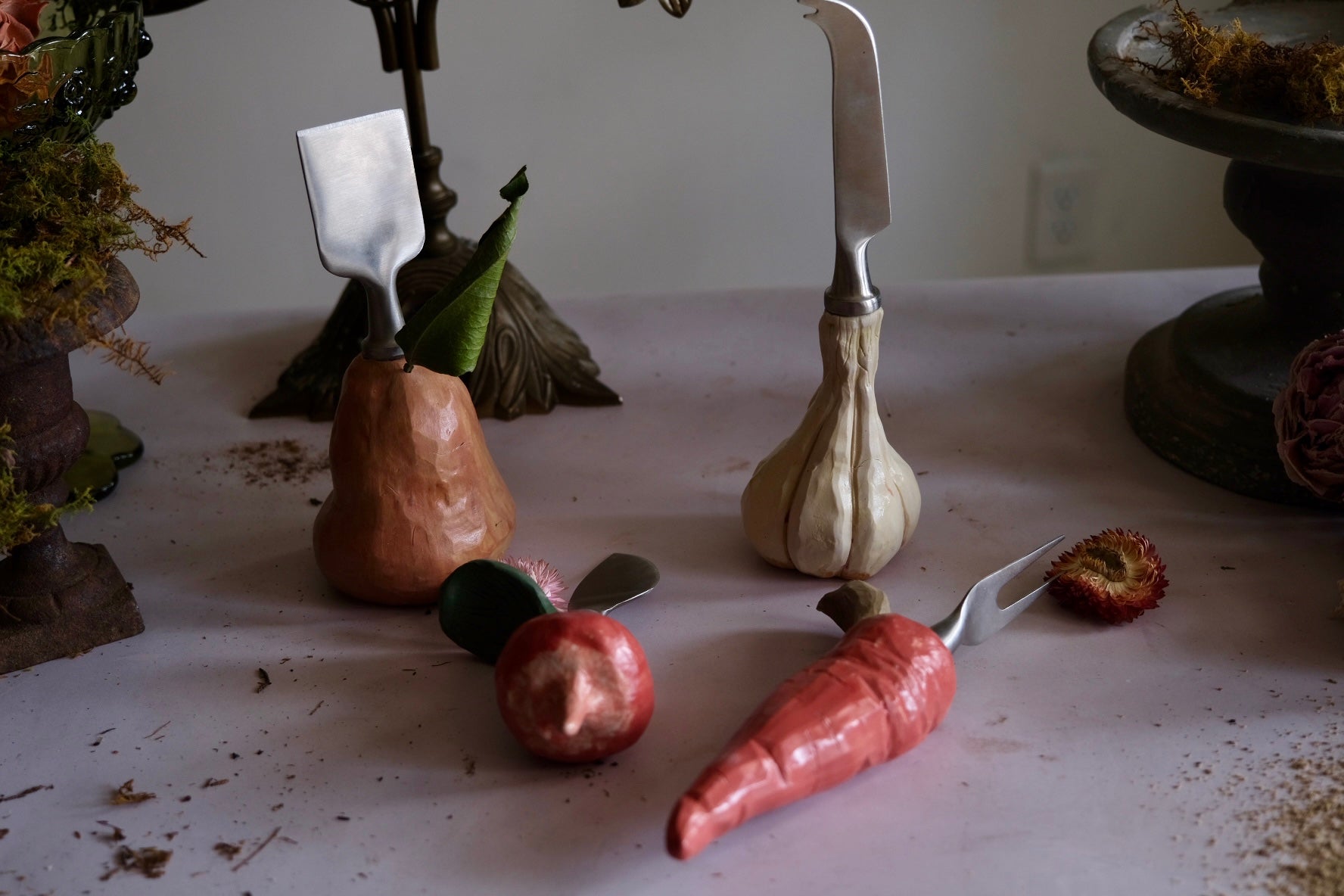 Hand molded from clay into a radish, garlic bulb, pear, and carrot with different cheese knife tops for the sweetest board.