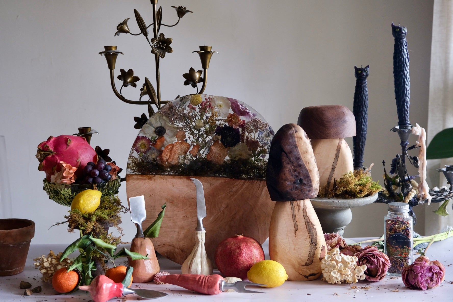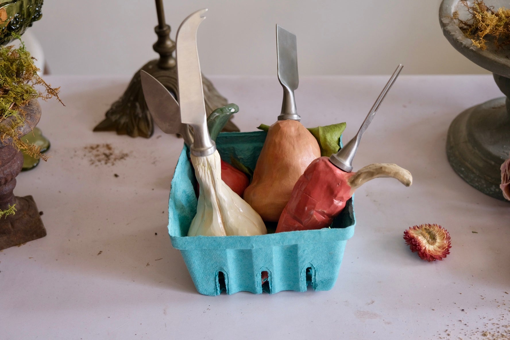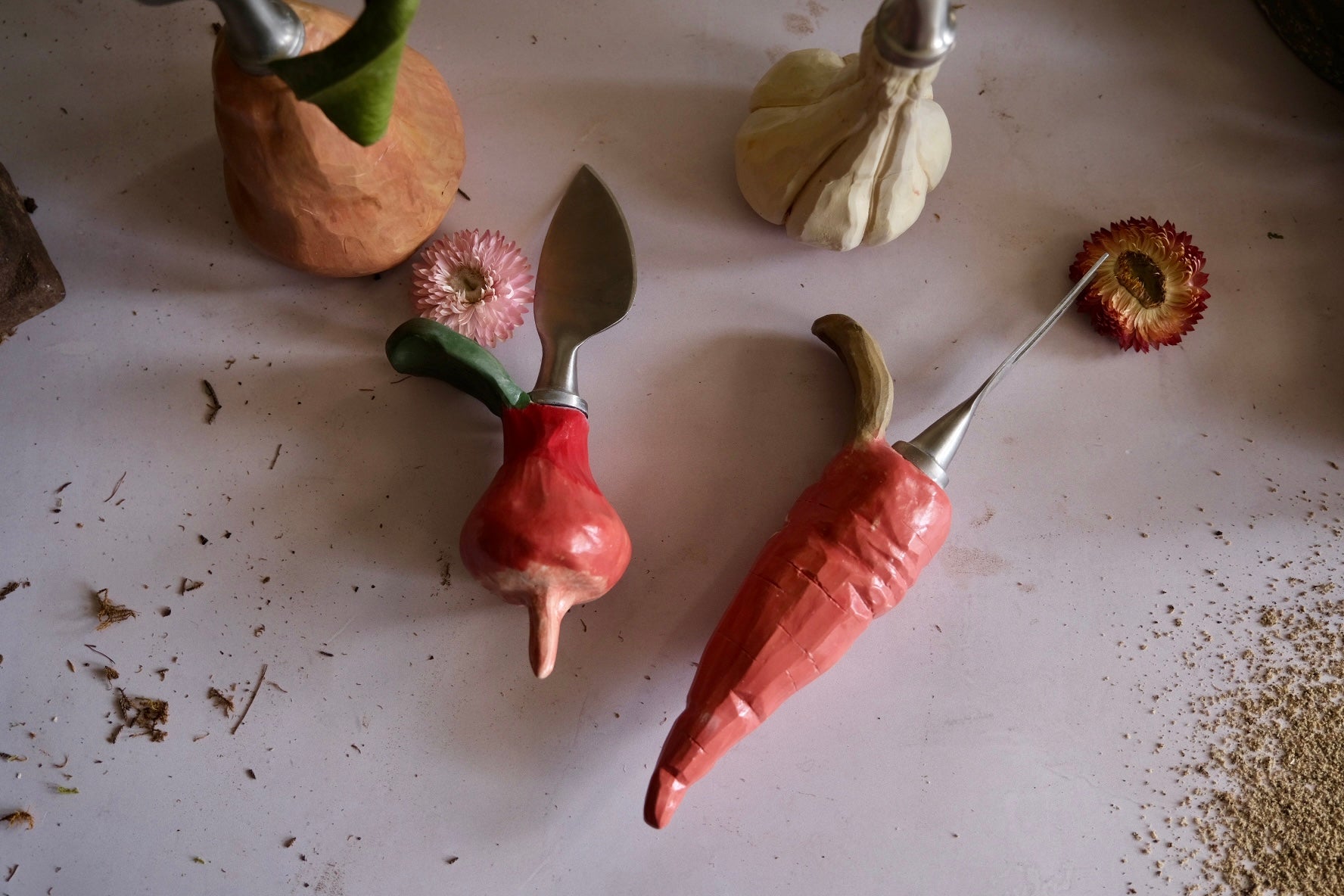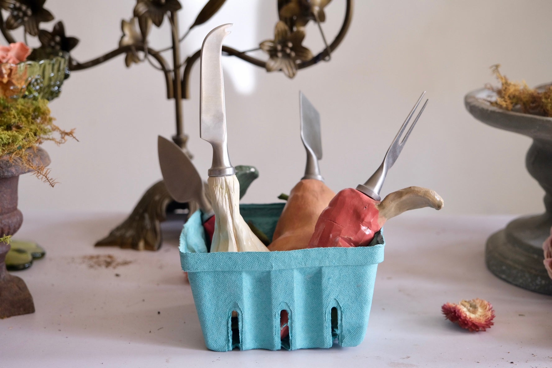Hand molded from clay into a radish, garlic bulb, pear, and carrot with different cheese knife tops for the sweetest board.