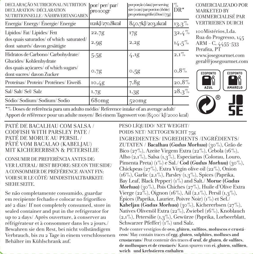 Introducing José Gourmet's Codfish with Parsley Pate. This 75g tin boasts a unique blend of ingredients including 30% Codfish, 20% chickpeas, and a medley of extra virgin olive oil, onion, garlic, parsley, and spices. This product is a true reflection of José Gourmet's commitment to adding value through quality production and consumption. It's an easy, delicious addition to your pantry, providing a taste of Portugal's rich culinary tradition right at your fingertips. Enjoy the Codfish with Parsley Pate as a spread on crusty bread or as a gourmet topping on your favorite dishes.