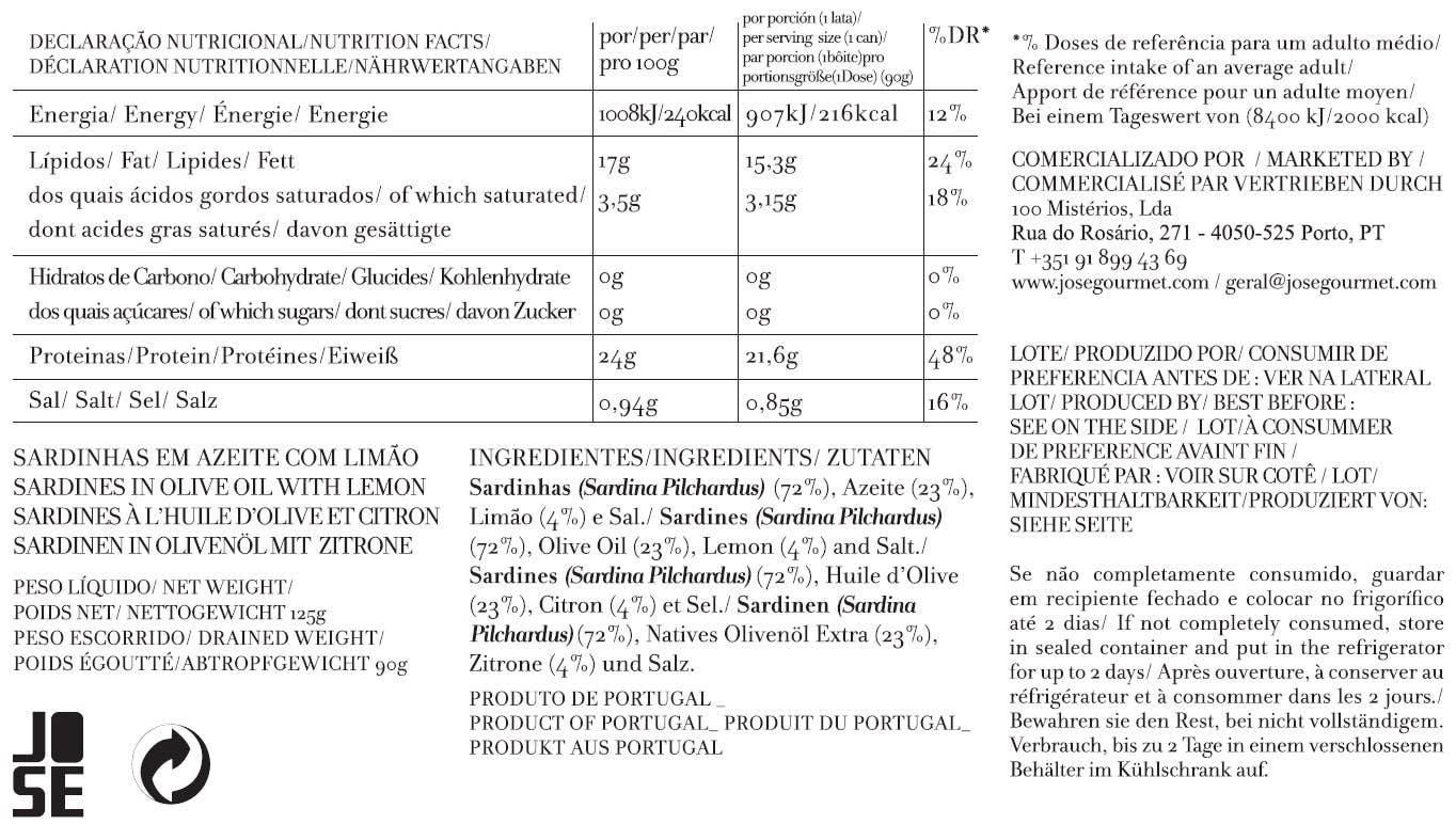 Indulge in the rich taste of José Gourmet's Sardines with Lemon and Olive Oil. These premium sardines, sourced sustainably, are packed in a blend of olive oil and tangy lemon, offering a delightful culinary experience. Composed of 72% sardines, 23% olive oil, and 4% lemon, this product provides a natural source of Omega-3. Enjoy it year-round, as a standalone dish or an addition to your recipes. José Gourmet is committed to enhancing the relationship between quality production and consumption, bringing you products of utmost quality and taste.