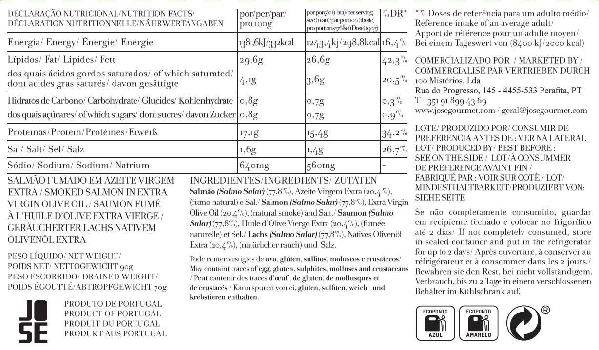 Experience the rich, smoky flavor of our José Gourmet Smoked Salmon, packed in high-quality extra virgin olive oil. Each 90g tin contains 77.8% salmon, carefully selected for its tenderness and taste. The salmon is enhanced by the subtle, smooth flavor of 20.4% extra virgin olive oil and a touch of natural smoke and salt. Our smoked salmon is available year-round, ensuring you can enjoy this gourmet treat in any season. As a part of José Gourmet's commitment to quality, we ensure an honest relationship with our suppliers and customers, prioritizing the quality of our products and the satisfaction of our customers. Savor the excellence of José Gourmet's Smoked Salmon in Extra Virgin Olive Oil, a true delight for the discerning palate.