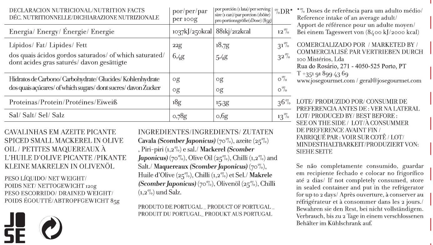 Experience the rich flavor of the sea with our José Gourmet Spiced Small Mackerel in Olive Oil. Each 120g tin contains 70% mackerel, caught and prepared with utmost care. Marinated in 25% olive oil and a dash of chilli, the mackerel retains its natural tenderness while adding a hint of spice. At José Gourmet, we pride ourselves on adding value to quality production and consumption. We stand by our commitment to quality, ensuring that our mackerel is sourced responsibly and prepared with excellent processes. Enjoy our product, knowing it's the result of fair trade and a dedication to the best in life.