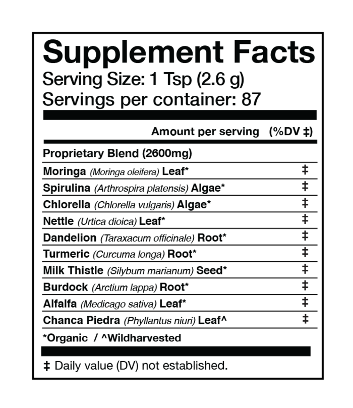 Ingredients: Moringa (Moringa oleifera) Leaf*, Spirulina (Arthrospira platensis) Algae*, Chlorella (Chlorella vulgaris) Algae*, Nettle (Urtica dioica) Leaf*, Dandelion (Taraxacum officinale) Root*, Turmeric (Curcuma longa) Root*, Milk Thistle (Sylibum marianum) Seed*, Burdock (Articum lappa) Root*, Alfalfa (Medicago sativa) Leaf*, Chanca Piedra (Phyllantus niuri) Leaf*