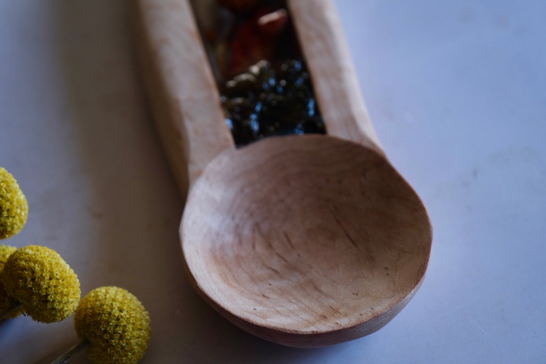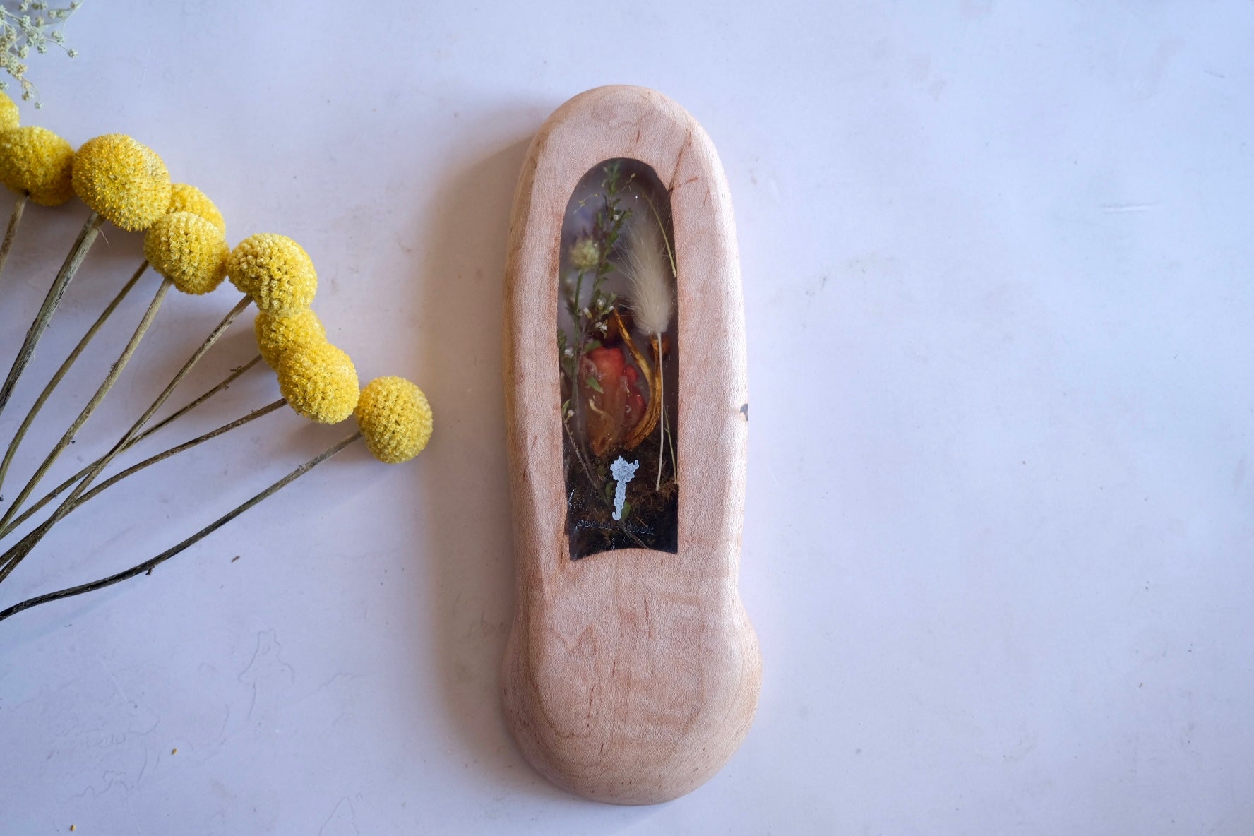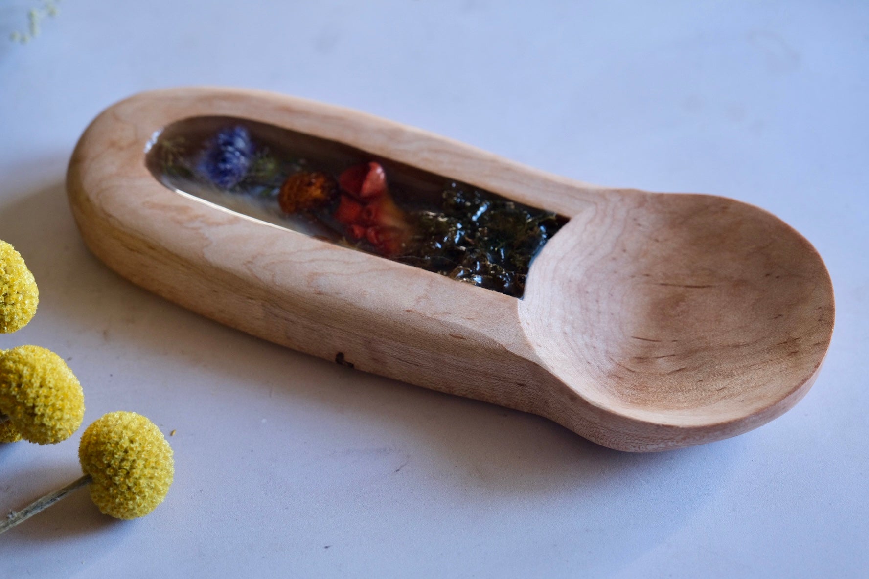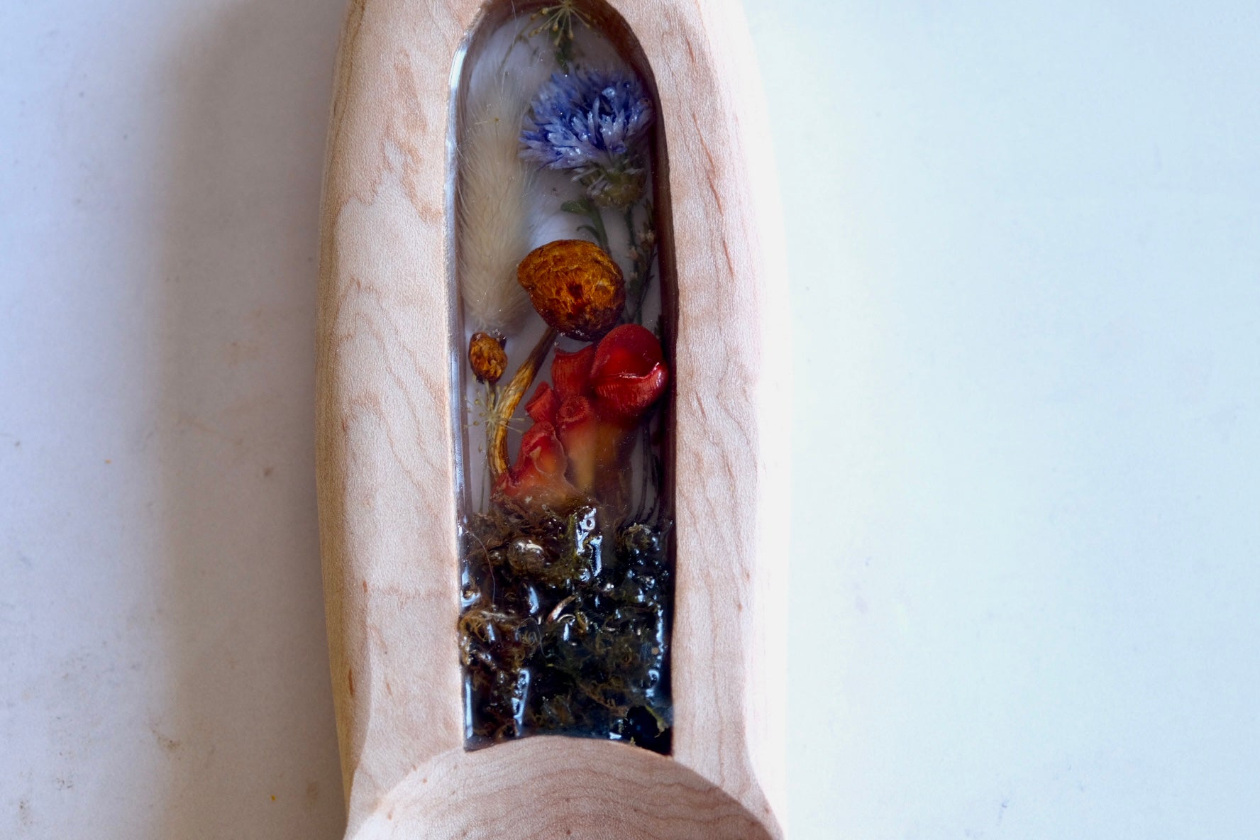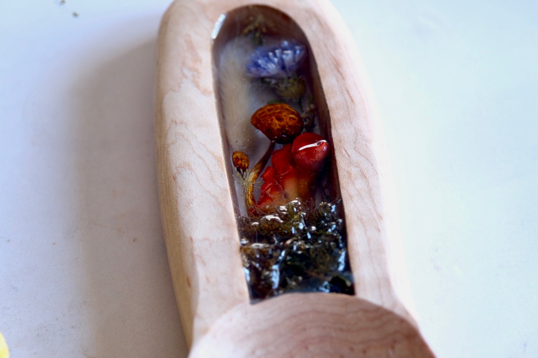 This beautiful scoop is made from ambrosia maple wood with a central casted scene of pink oyster mushroom, bachelors button, bunny tail grass, chestnut mushoom, moss and much more. The entire piece is sealed using spoon + hook wood care. Please hand wash and towel dry and re-oil as needed.