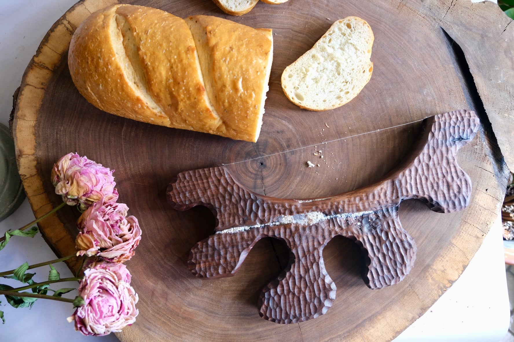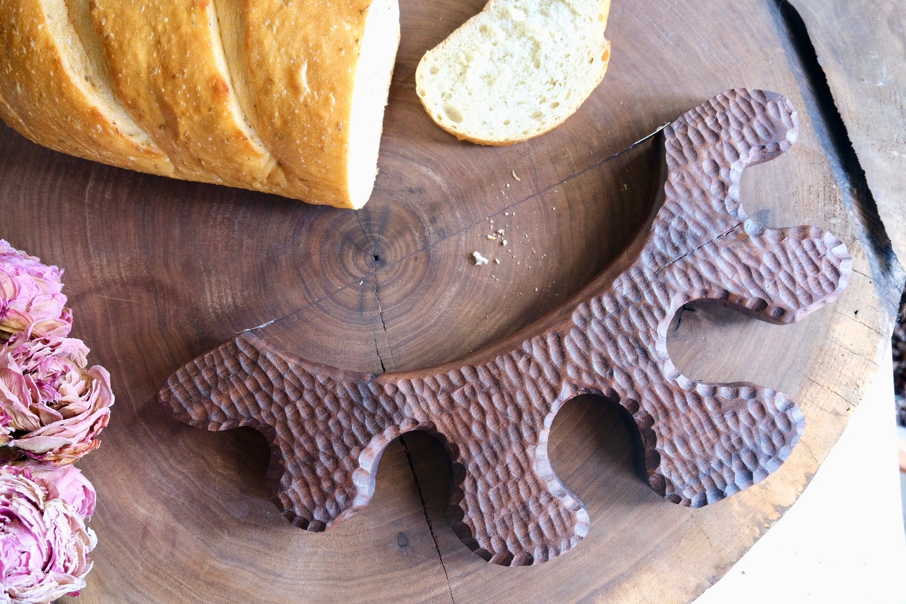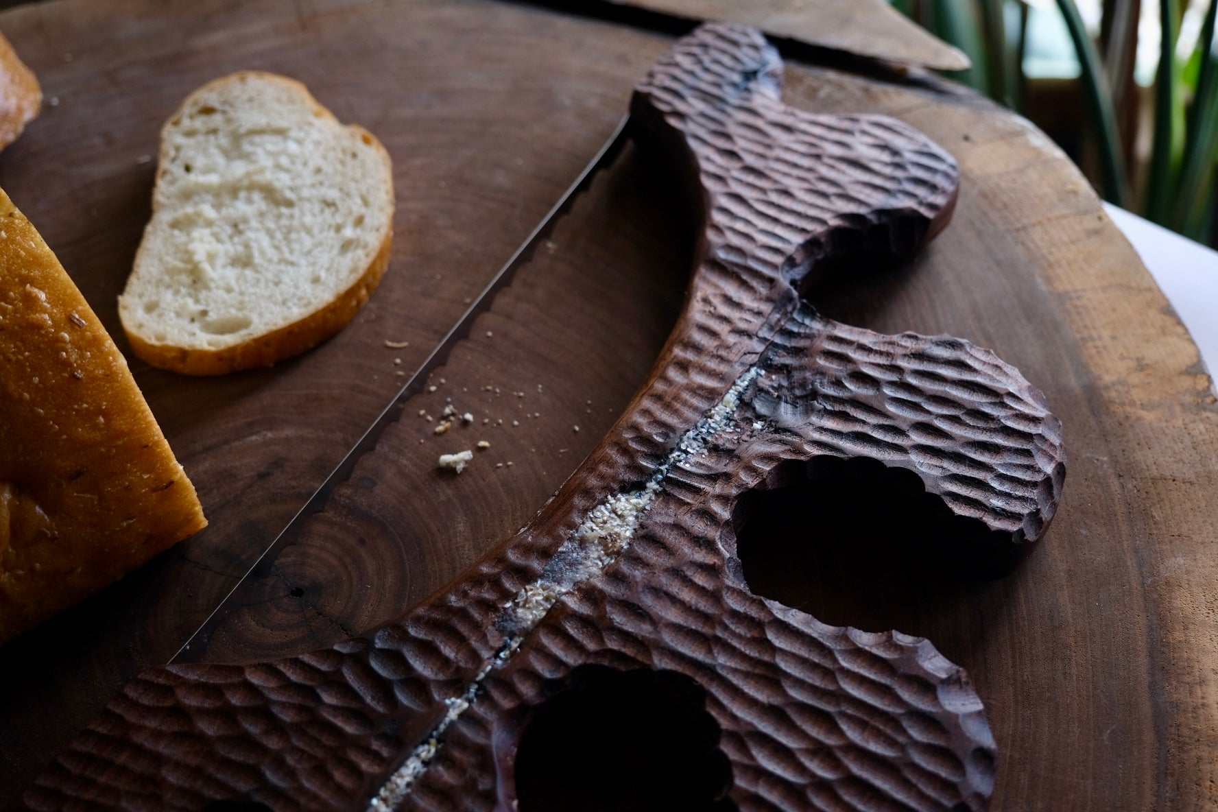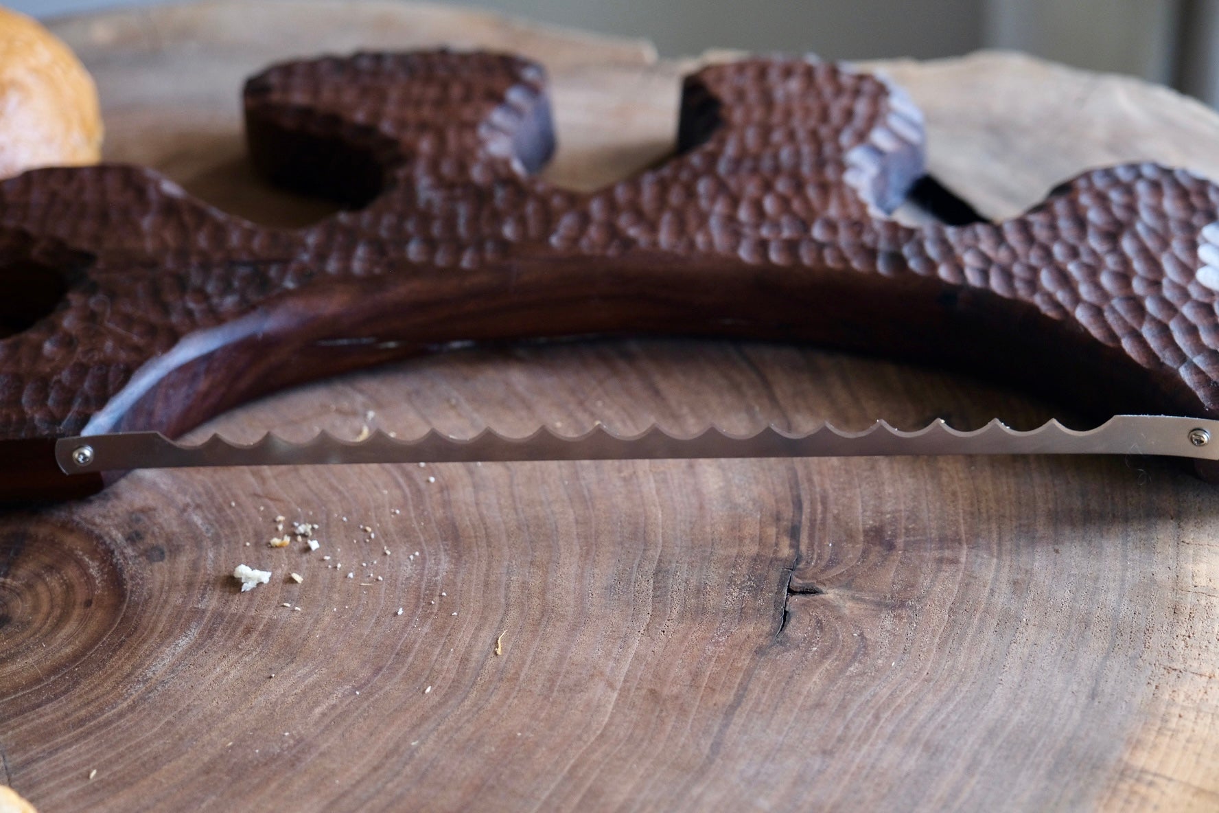 This beautiful bread knife is a take on the classic. Made from walnut wood with moonstone, amethyst and turquoise inlayed and carved completely for texture. The knife blade itself is very sharp!