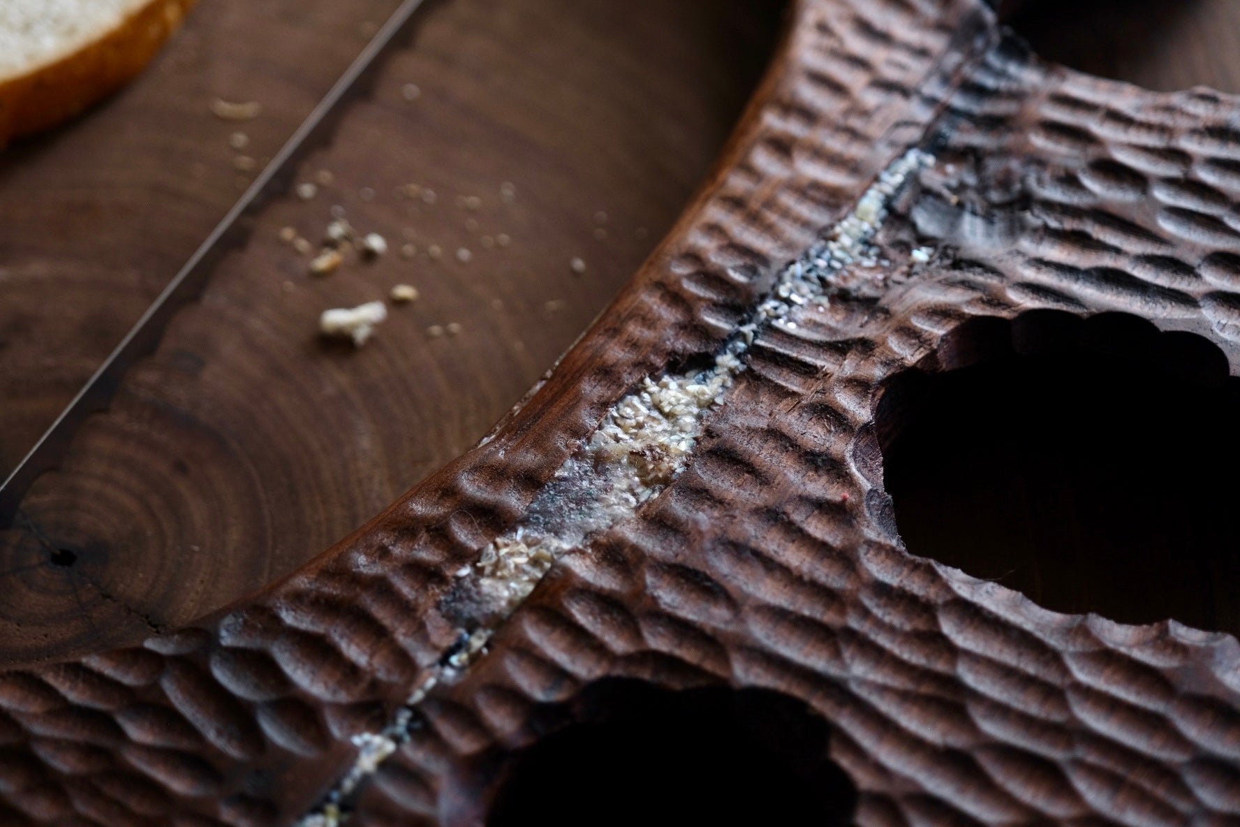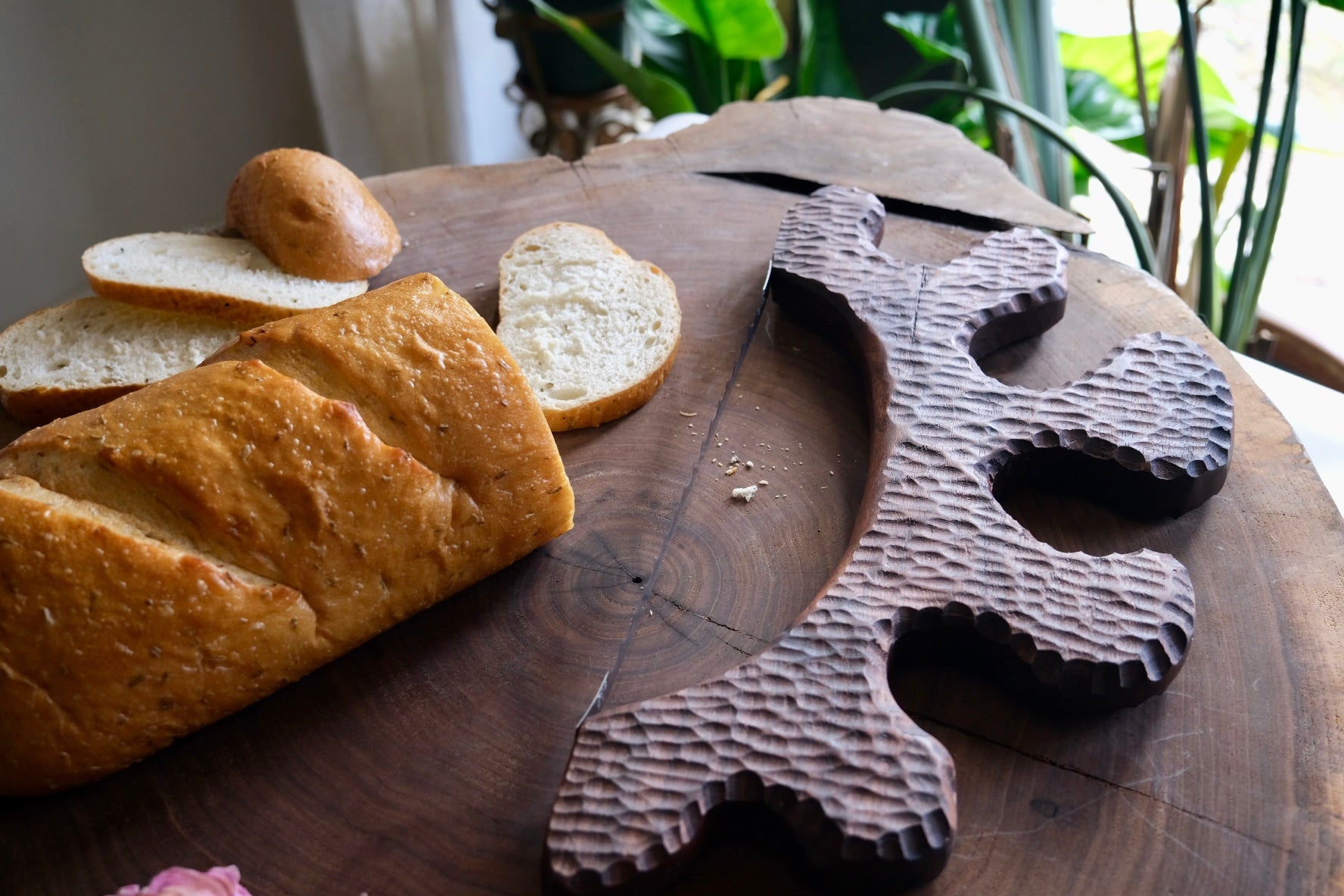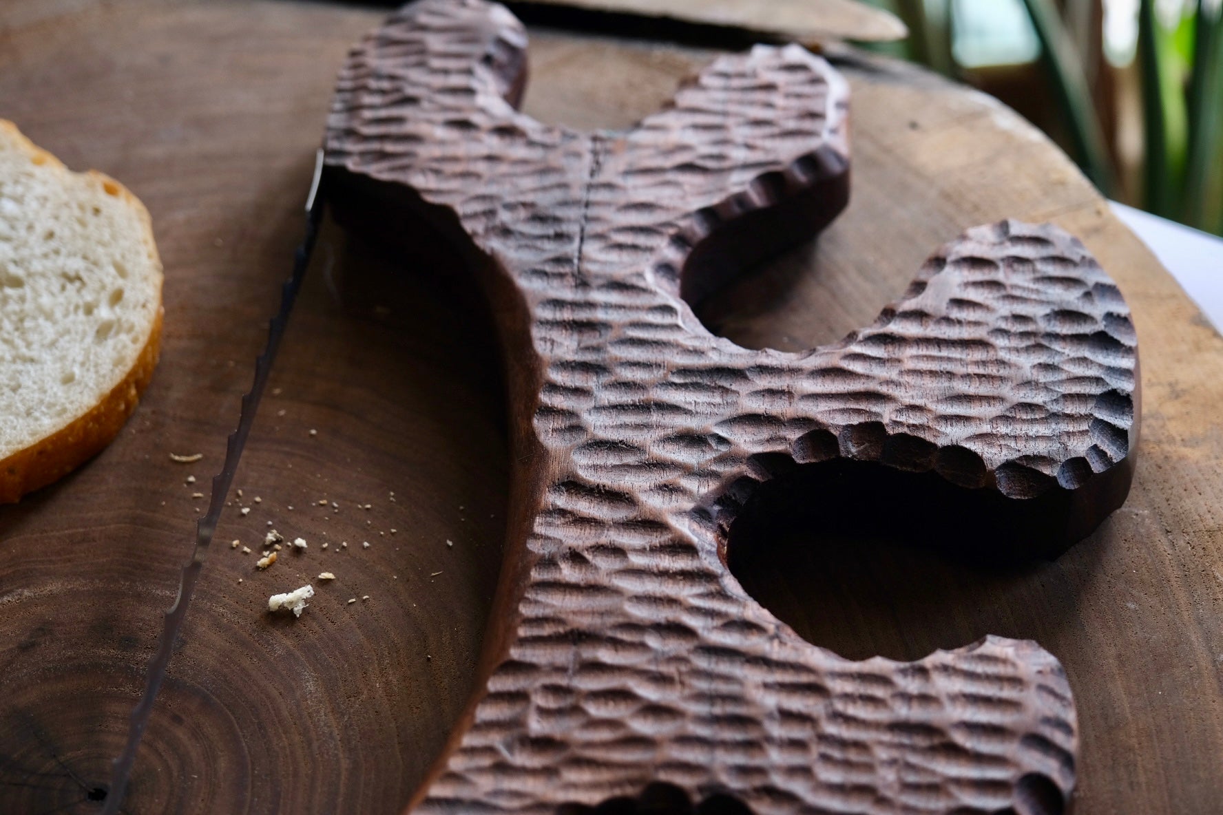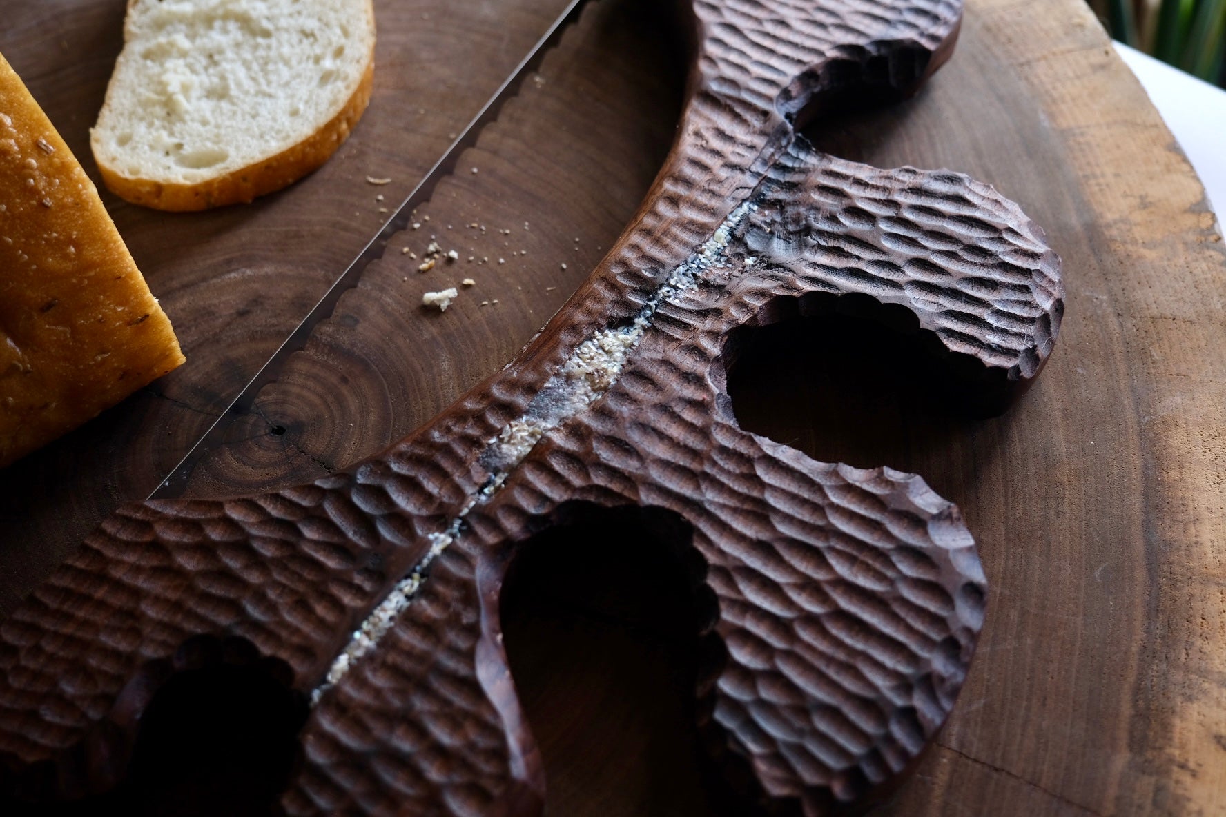 This beautiful bread knife is a take on the classic. Made from walnut wood with moonstone, amethyst and turquoise inlayed and carved completely for texture. The knife blade itself is very sharp!