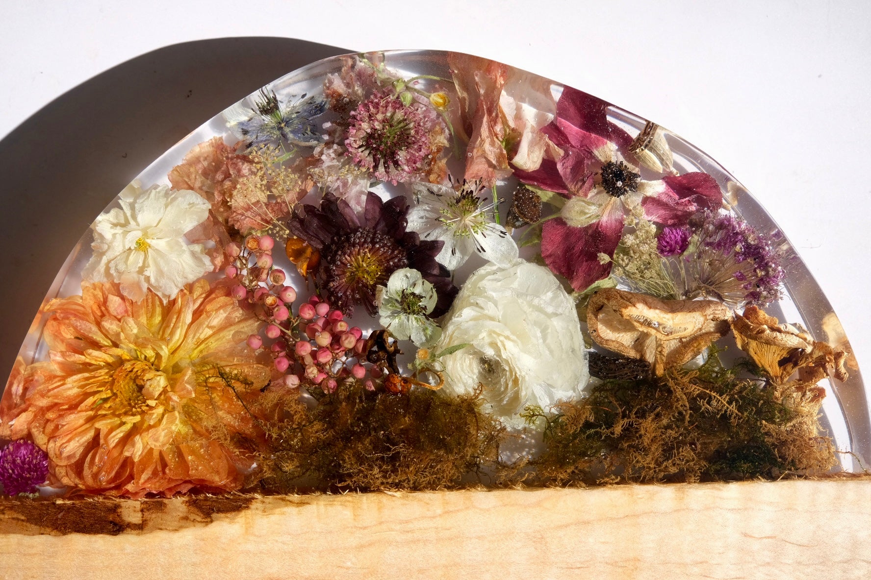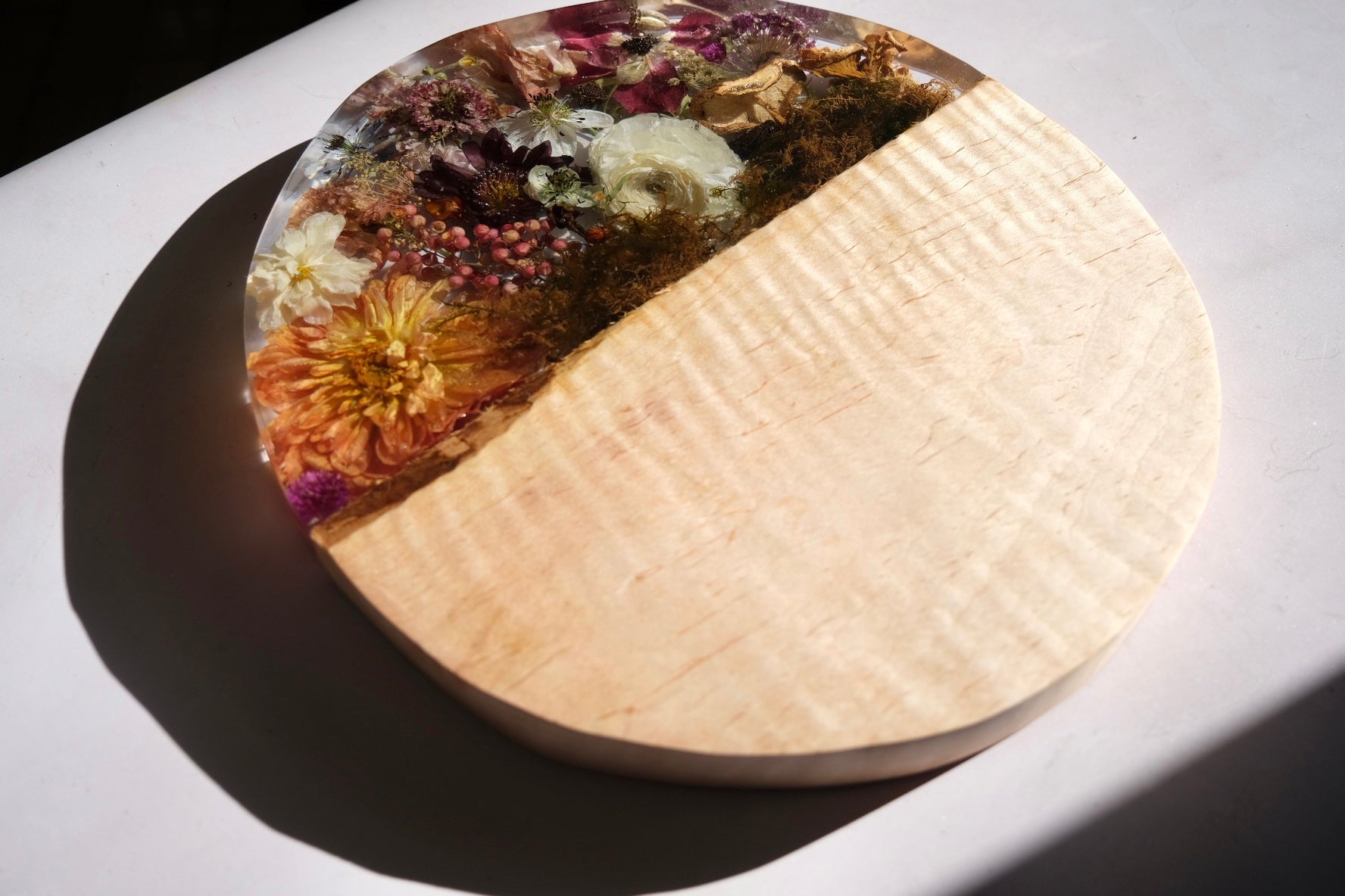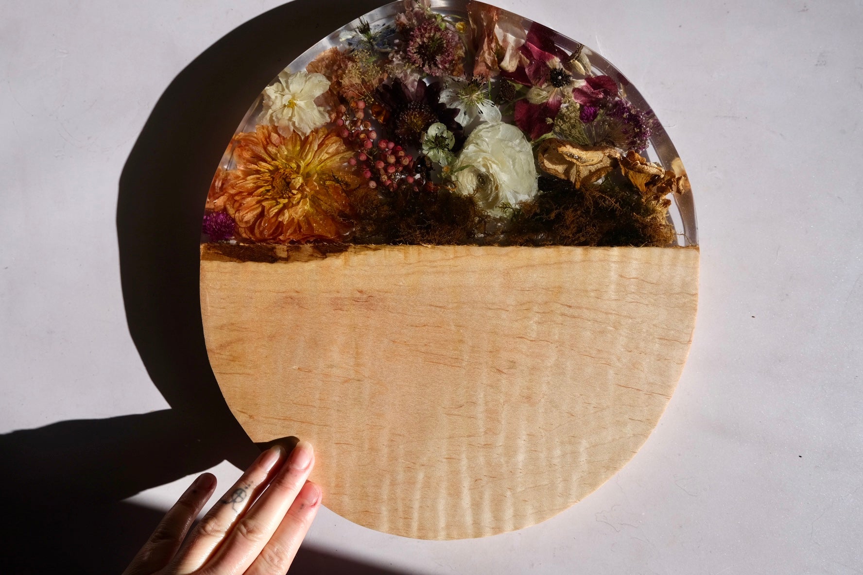 This beauty is made from ambrosia maple wood with a sated scene of dahlia, pepper berry, poppy, anemone, pepper berry, scabiosa, lisianthus, beech leaf, pink oyster mushroom, moss, and so much more. Please hand wash and towel dry and re-oil as needed. Sealed using spoon + hook wood care.