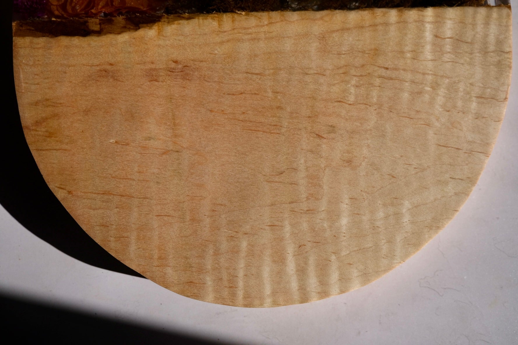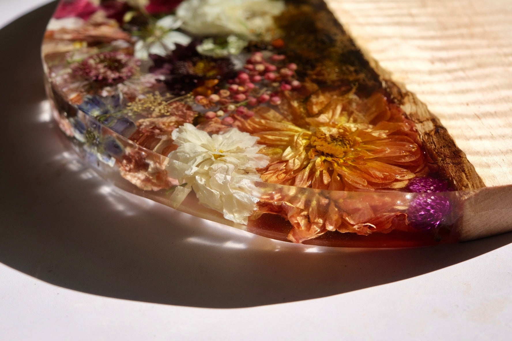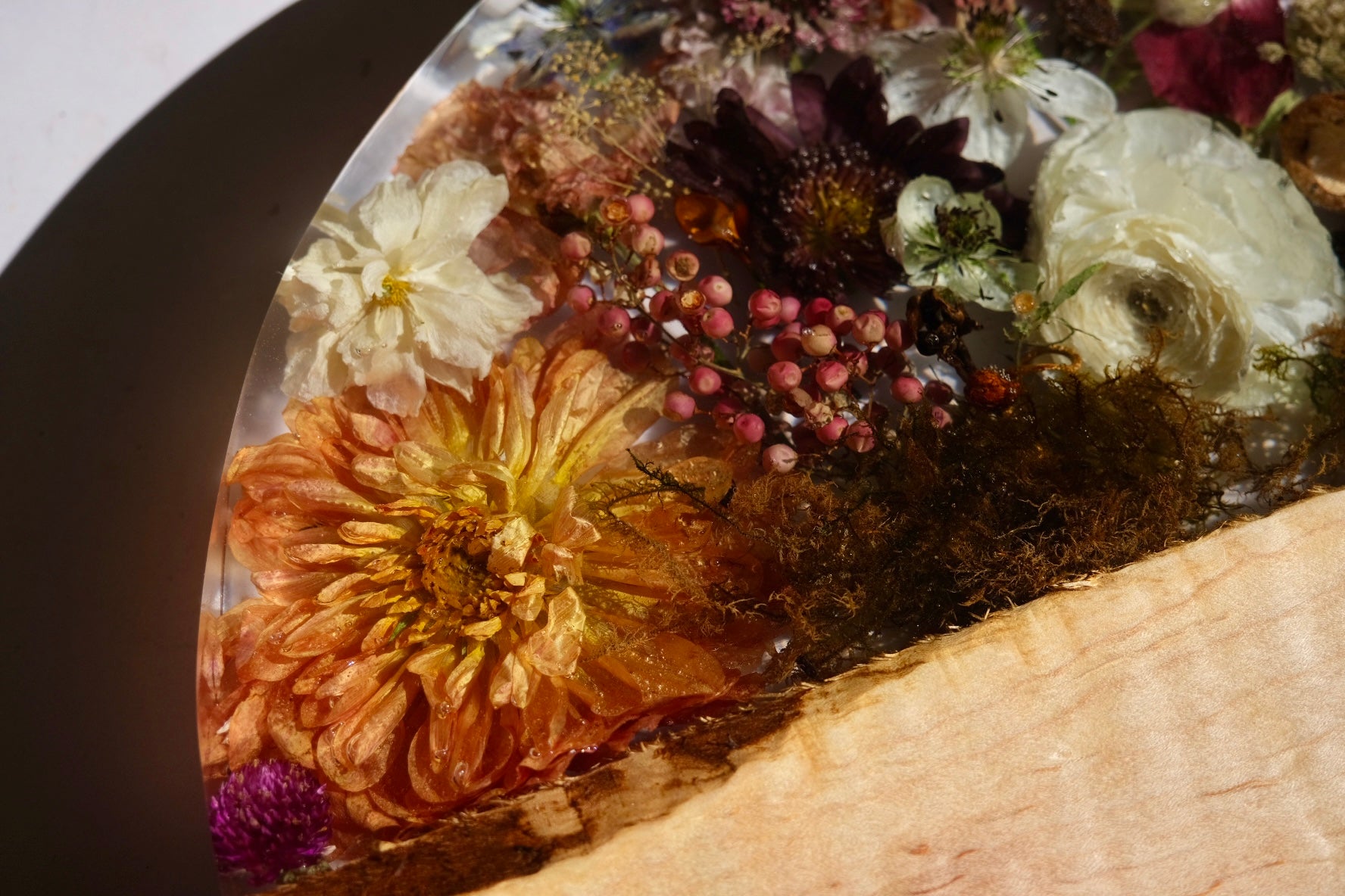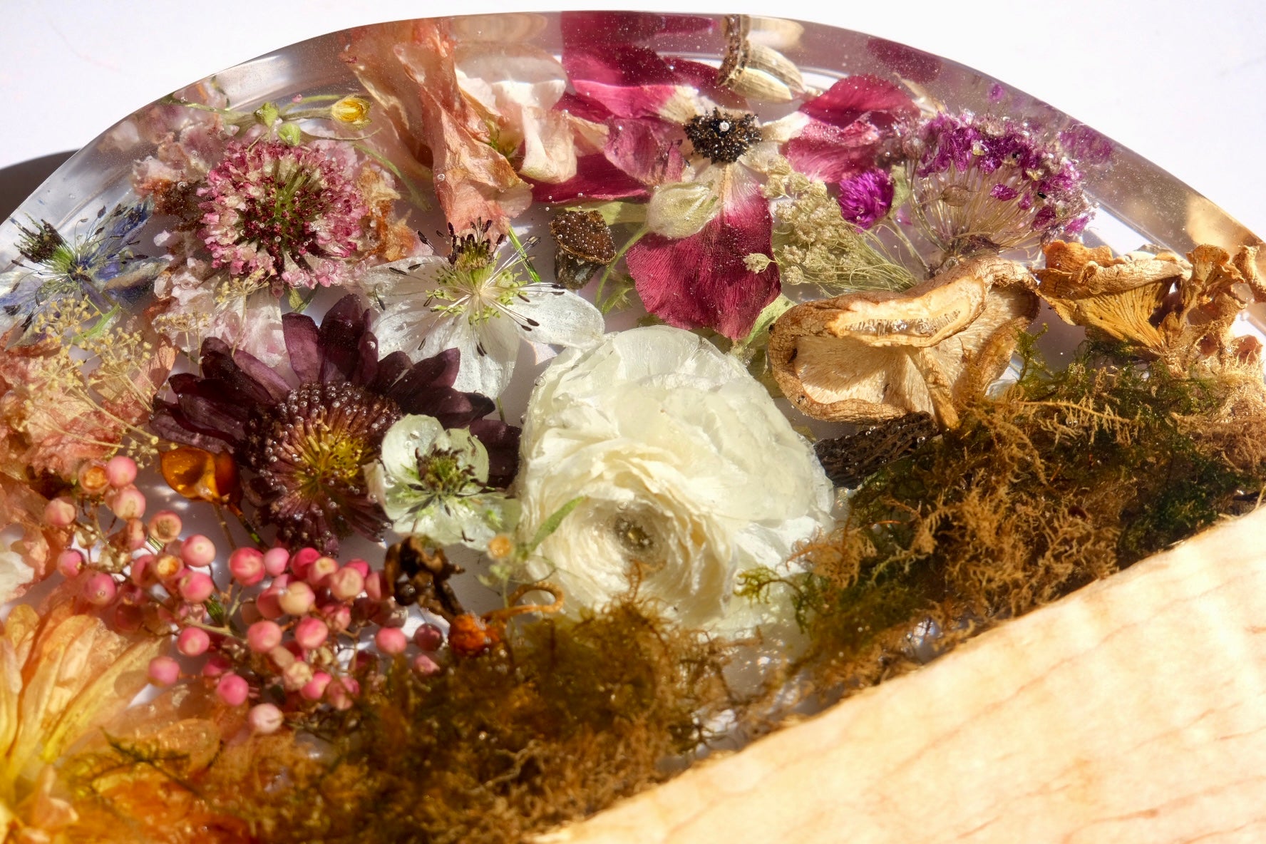 This beauty is made from ambrosia maple wood with a sated scene of dahlia, pepper berry, poppy, anemone, pepper berry, scabiosa, lisianthus, beech leaf, pink oyster mushroom, moss, and so much more. Please hand wash and towel dry and re-oil as needed. Sealed using spoon + hook wood care.