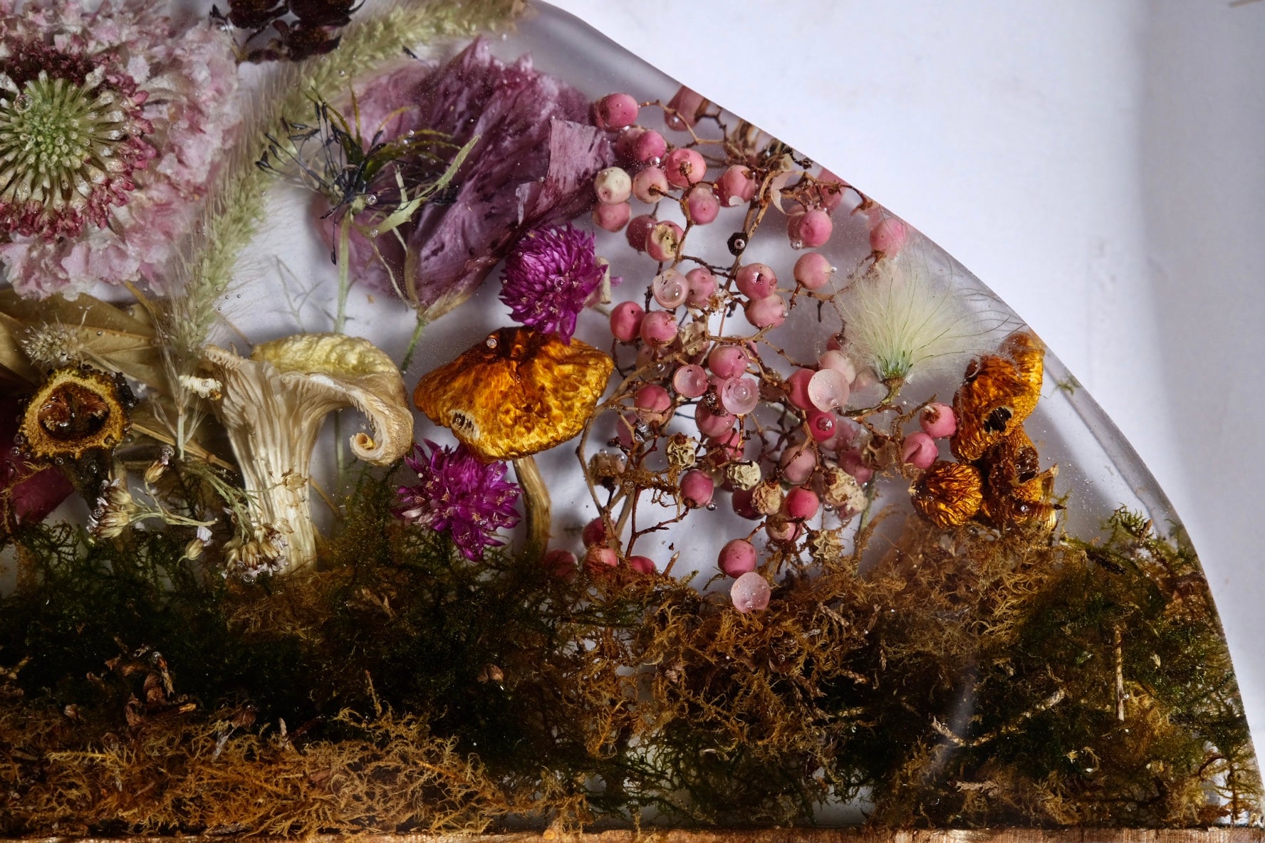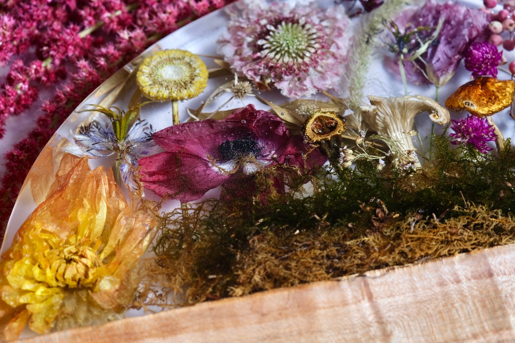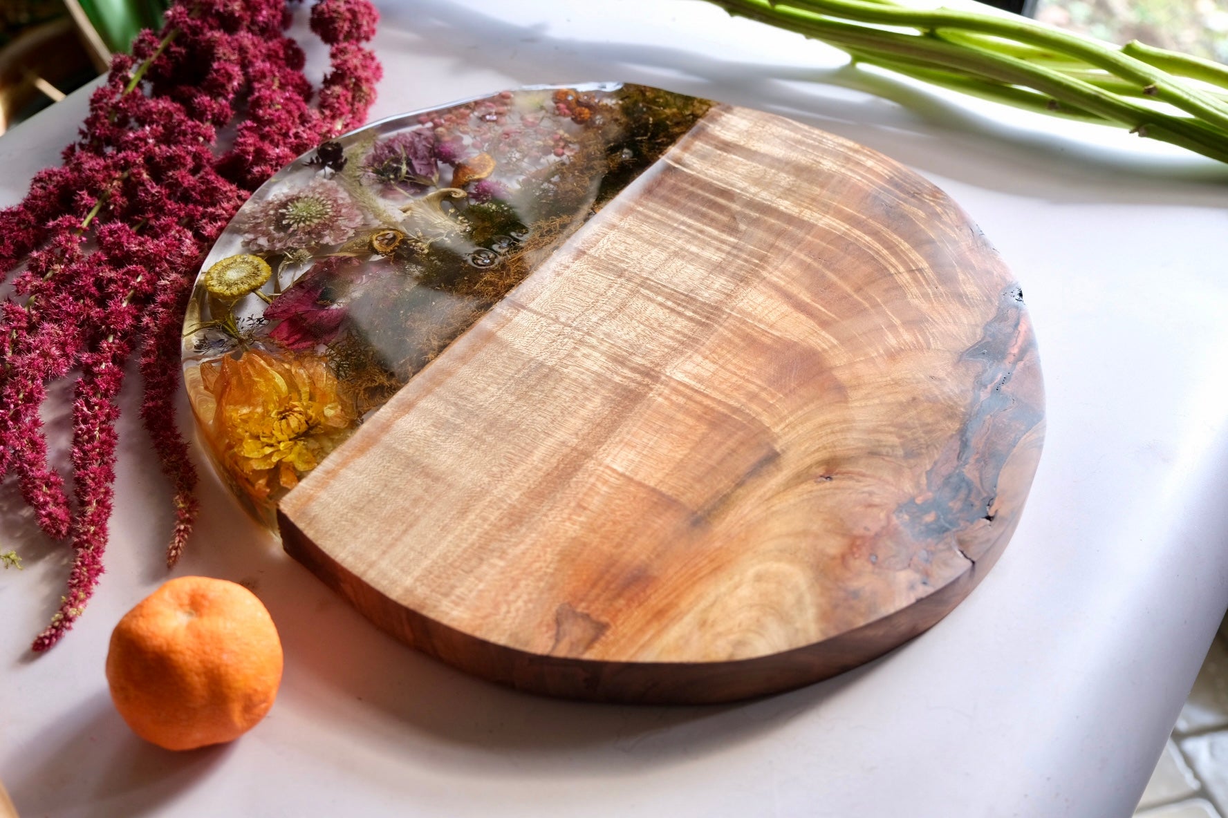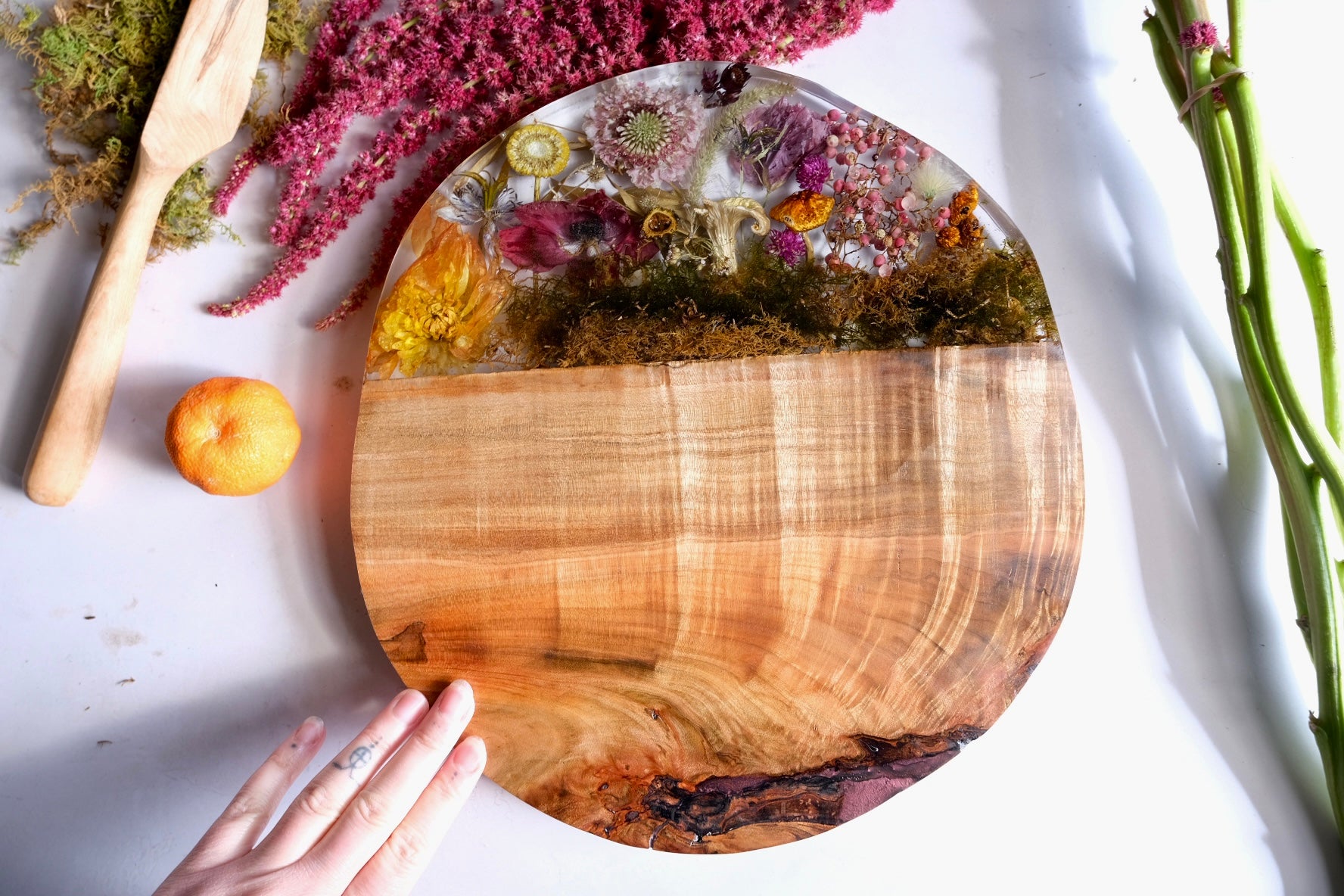 This beautiful board is made from figured maple with a casted scene of billy ball, scabiosa, dahlia, linden, yellow oyster mushrooms and, chestnut mushroom, moss, nigella, and more. Please hand wash and towel dry and re-oil as needed.