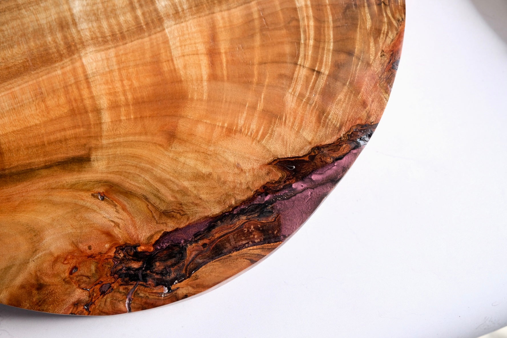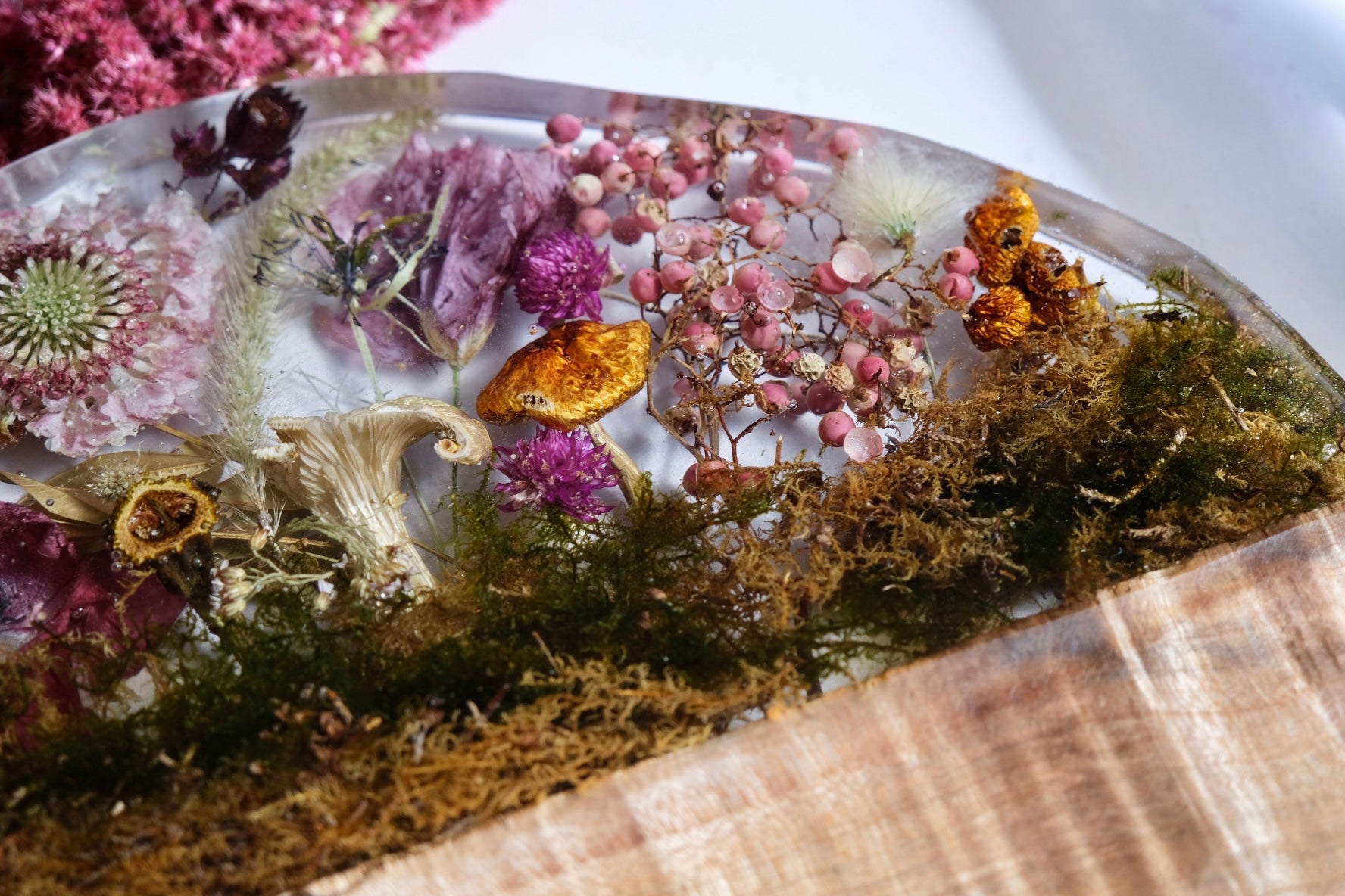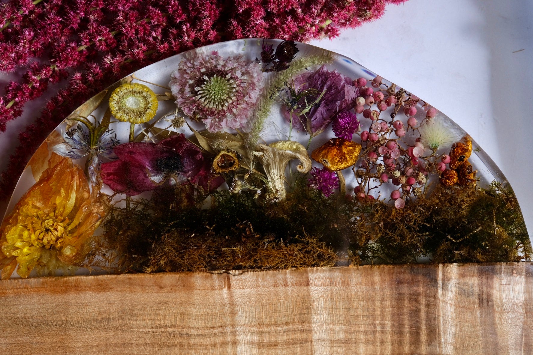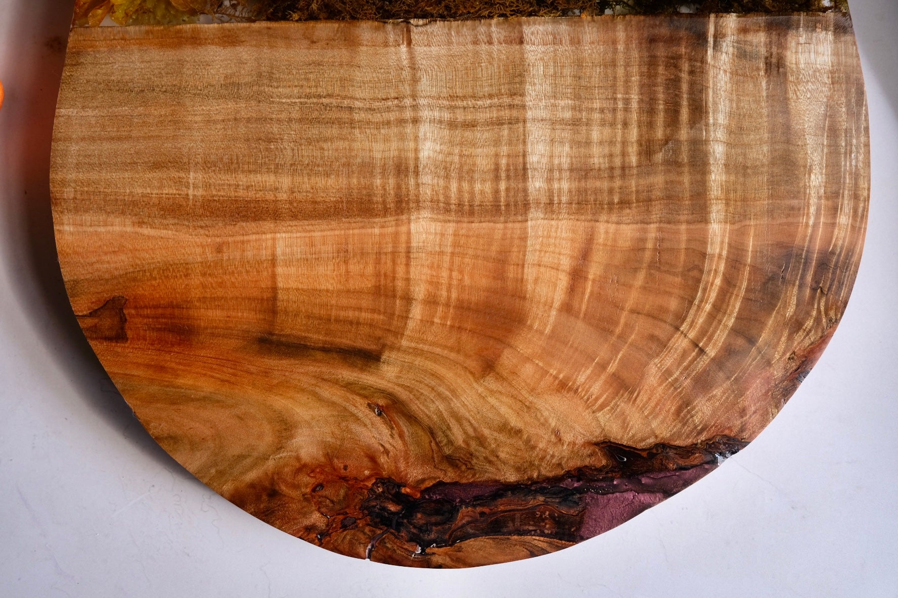 This beautiful board is made from figured maple with a casted scene of billy ball, scabiosa, dahlia, linden, yellow oyster mushrooms and, chestnut mushroom, moss, nigella, and more. Please hand wash and towel dry and re-oil as needed.