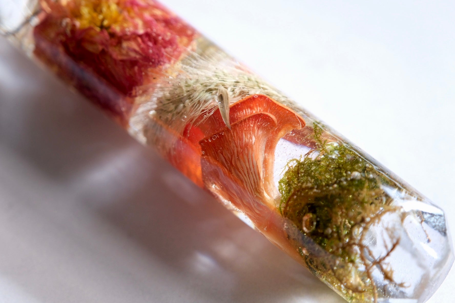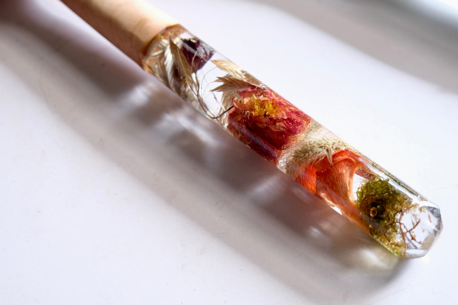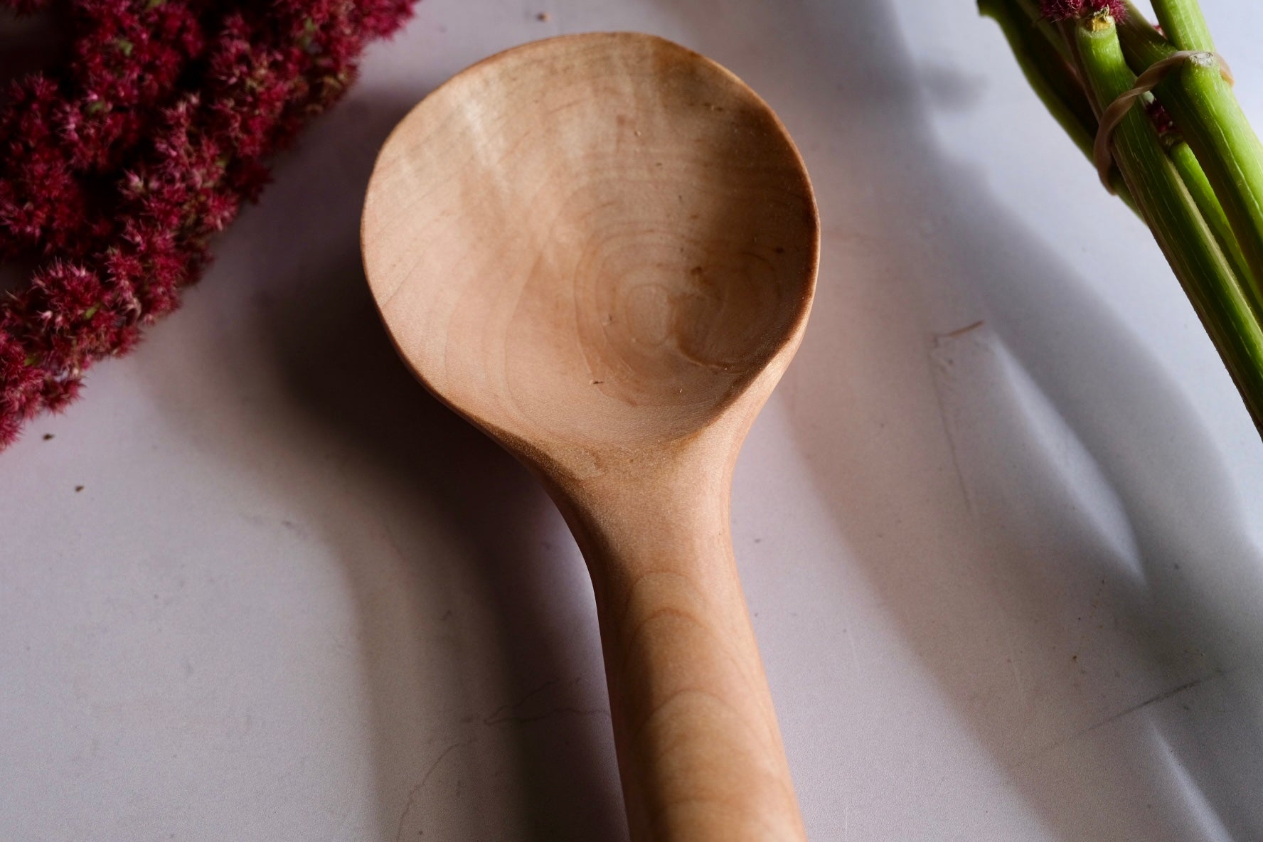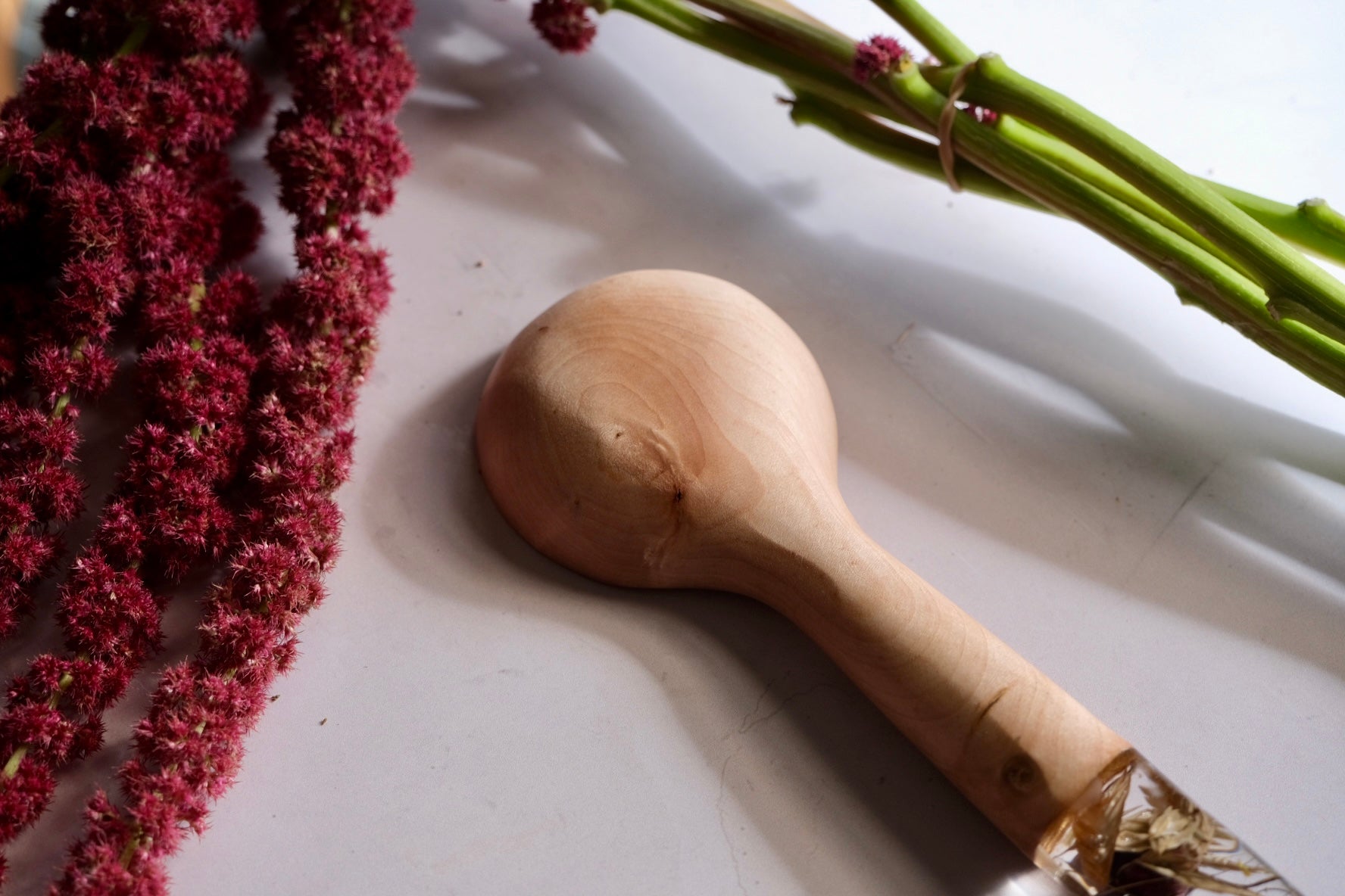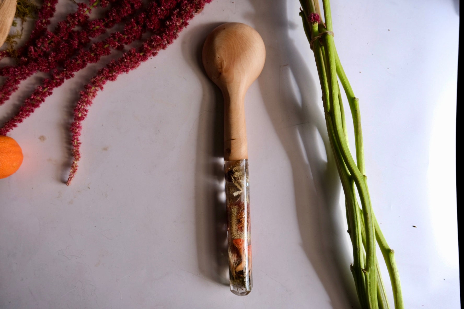 This spoon is made from stunning maple wood with a casted handle of sea oats, dahlia, pink oyster mushrooms, wheat, and moss. Please hand wash and towel dry and re-oil as needed.