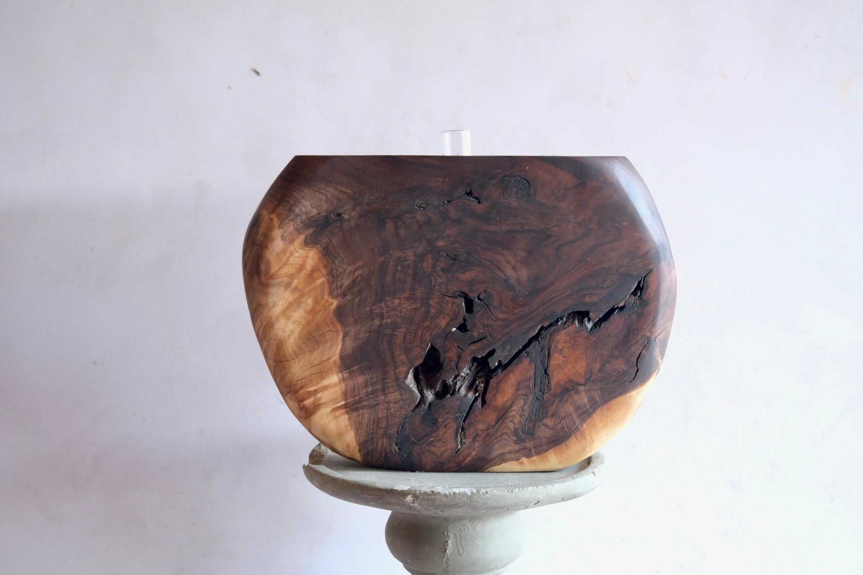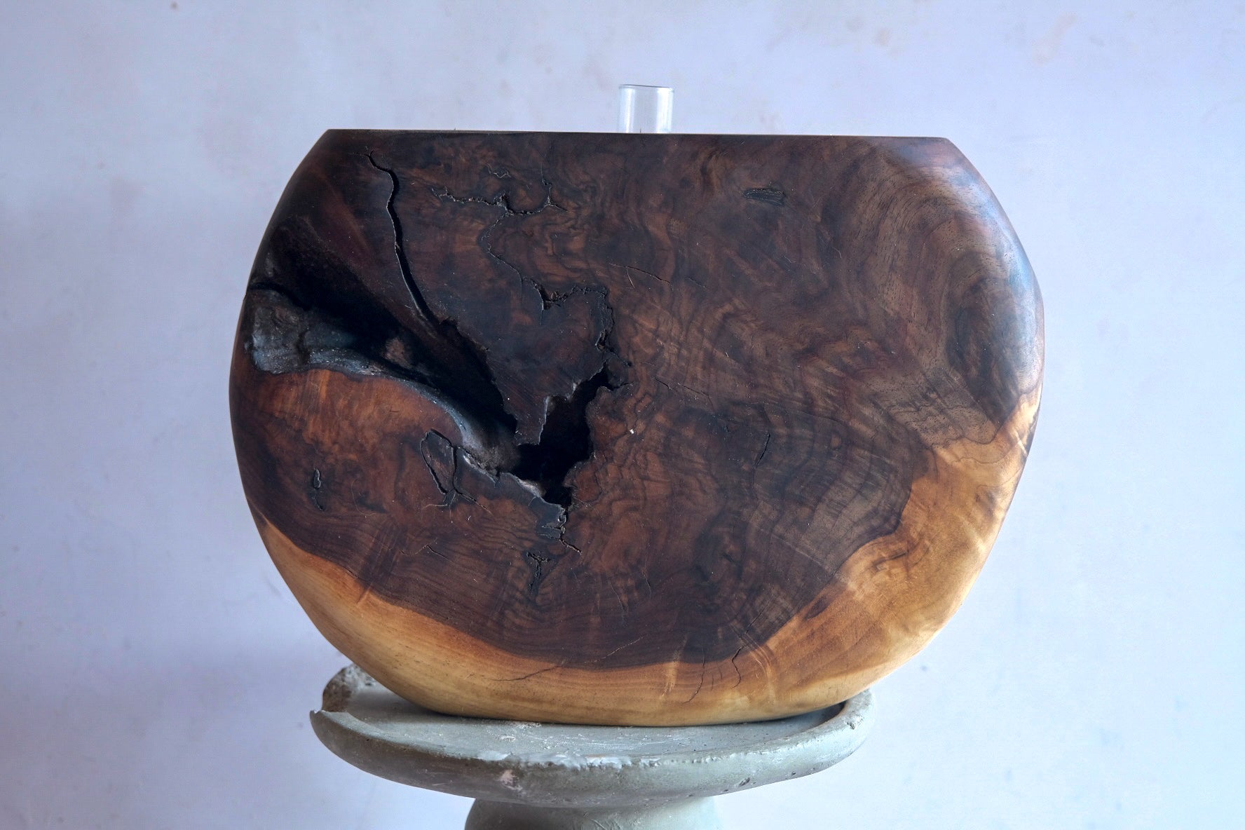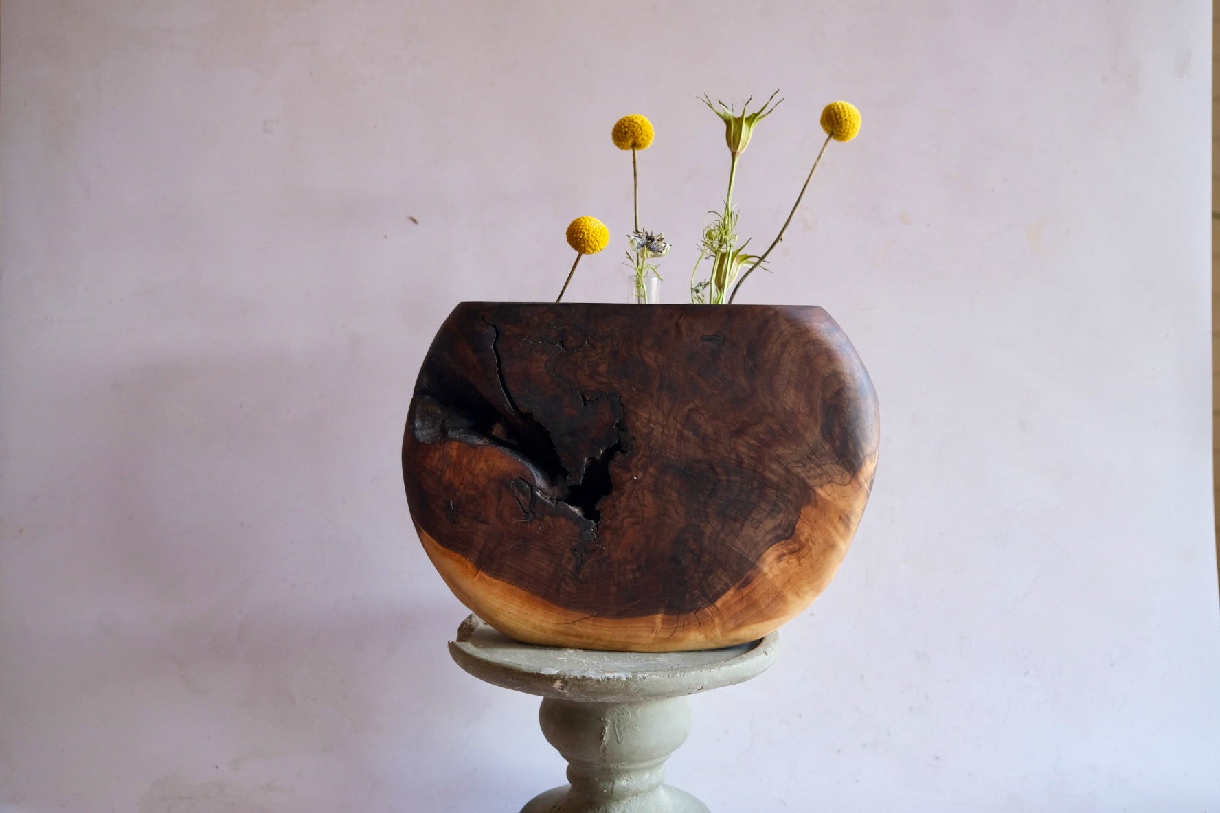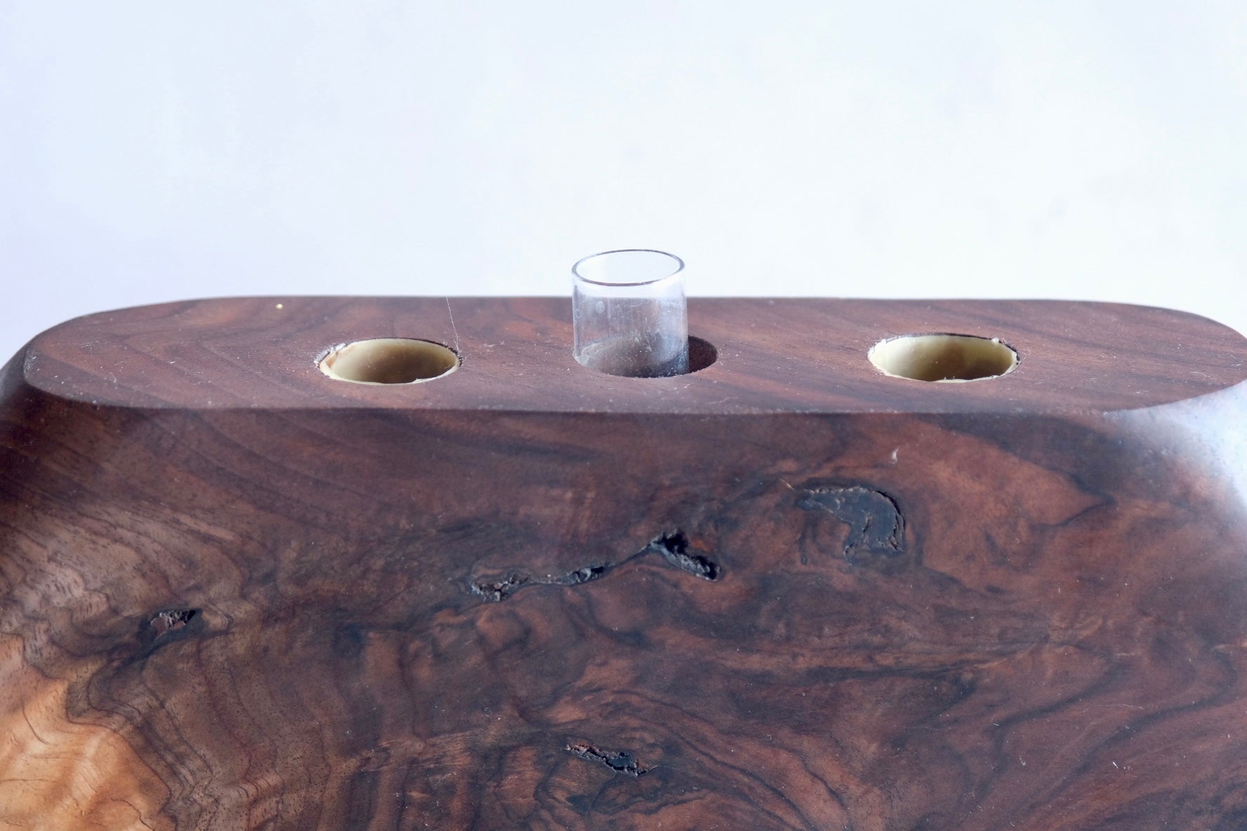 This beautiful vase is some of the last walnut i sourced before Helene hit. Made with three vase holes, two filled with bees wax to ensure no wood can get in and one with a glass vial vase for water to not penetrate the wood. The entire piece is sealed using spoon + hook wood care.