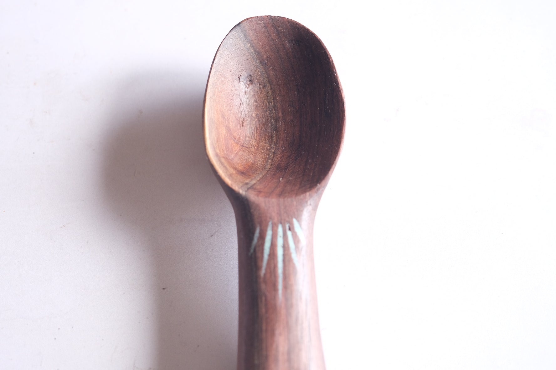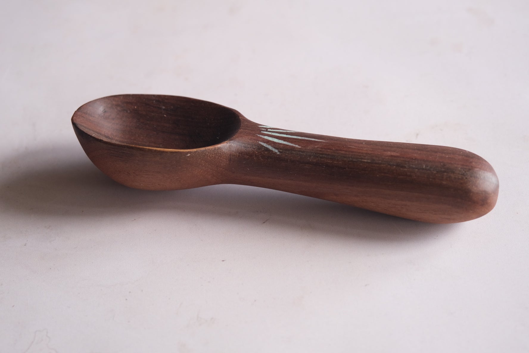 This beautiful ice cream scoop is carved from walnut wood with turquoise sun rays inlayed into the neck of the bowl. The entire piece is sealed using spoon + hook wood care. Please hand wash and towel dry and re-oil as needed.