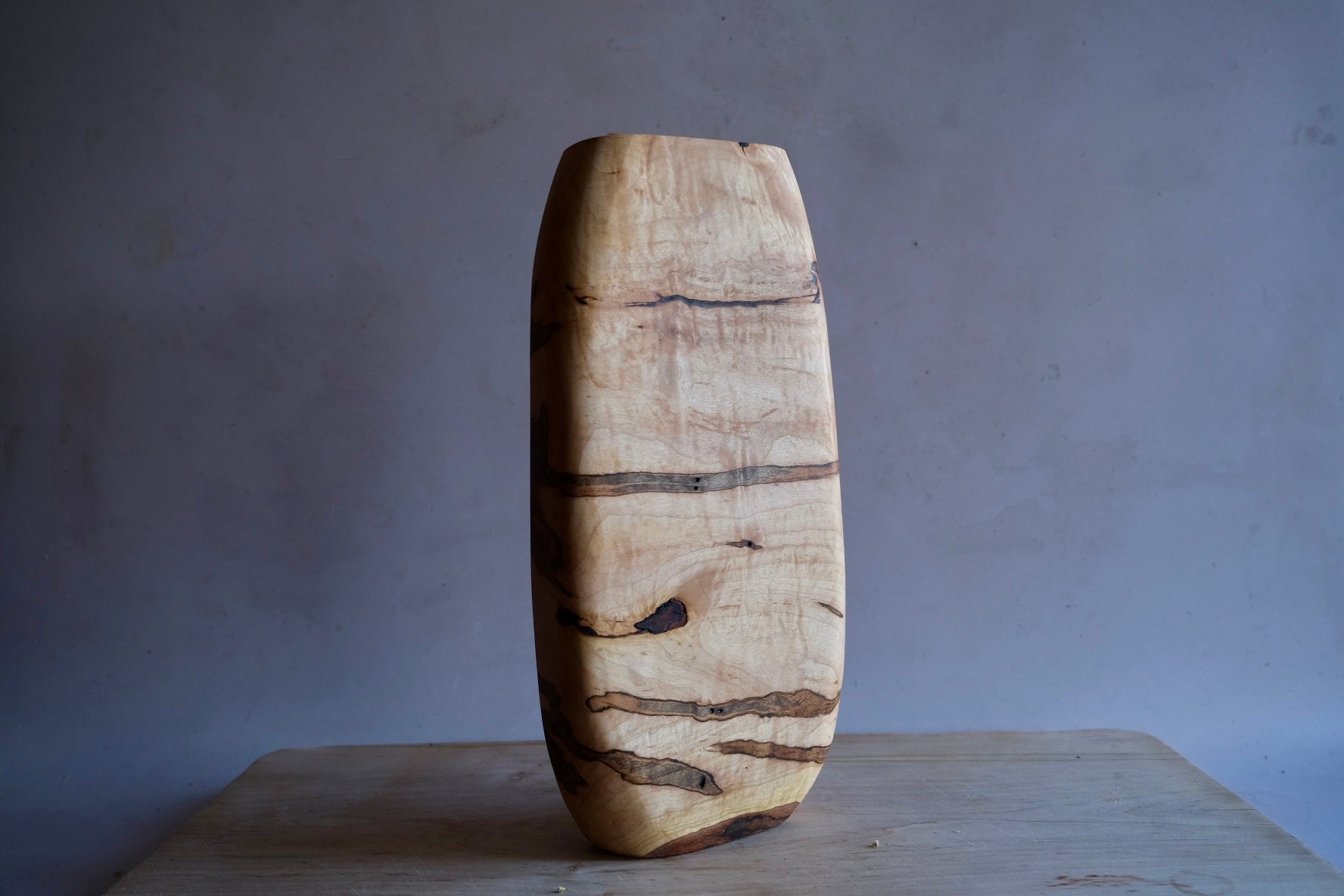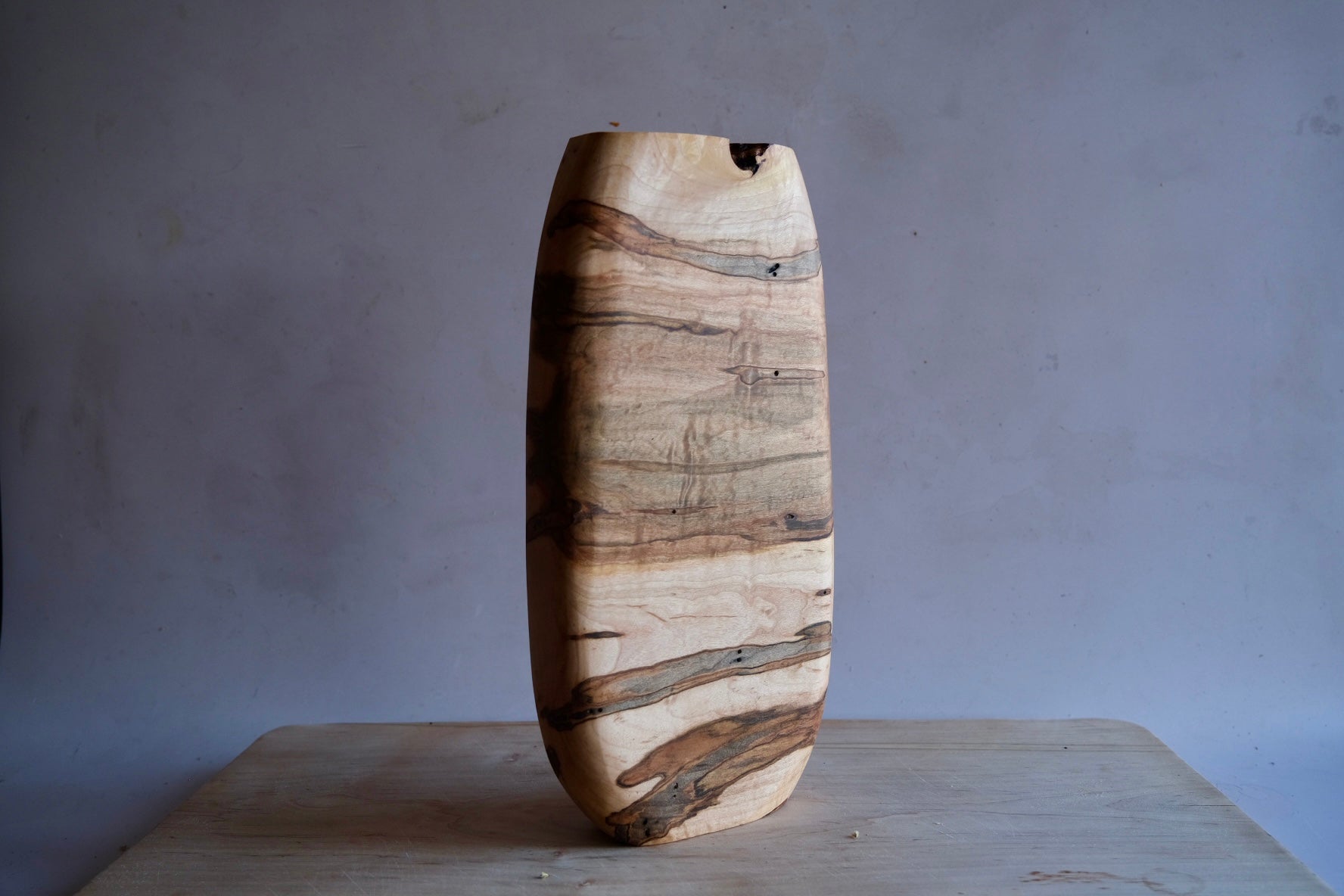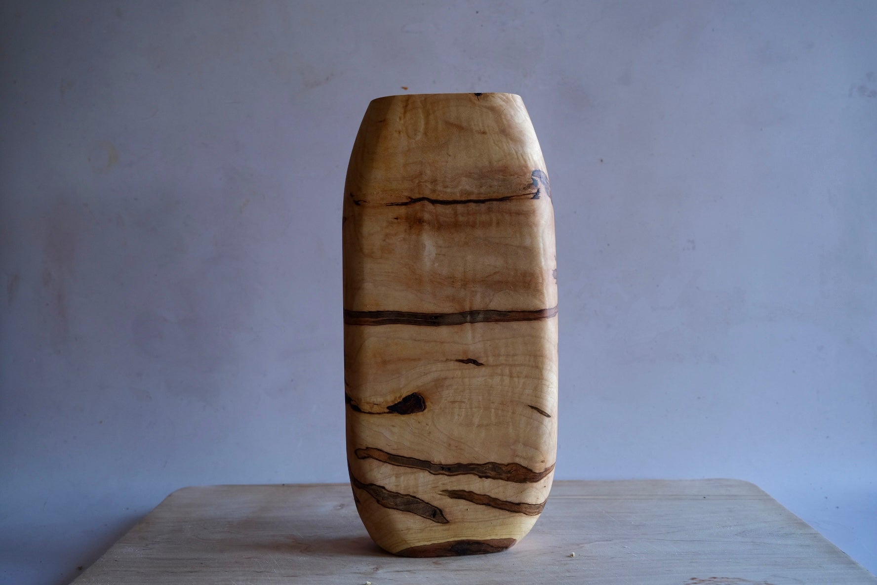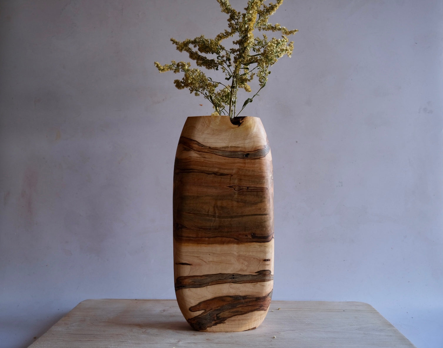 This beautiful vase is made from ambrosia maple and has such a beautiful grain to it. In the sun it glistens. The hole of the vase is sealed using bees wax to ensure water cannot penetrate the wood. The entire piece is sealed using spoon + hook wood care.