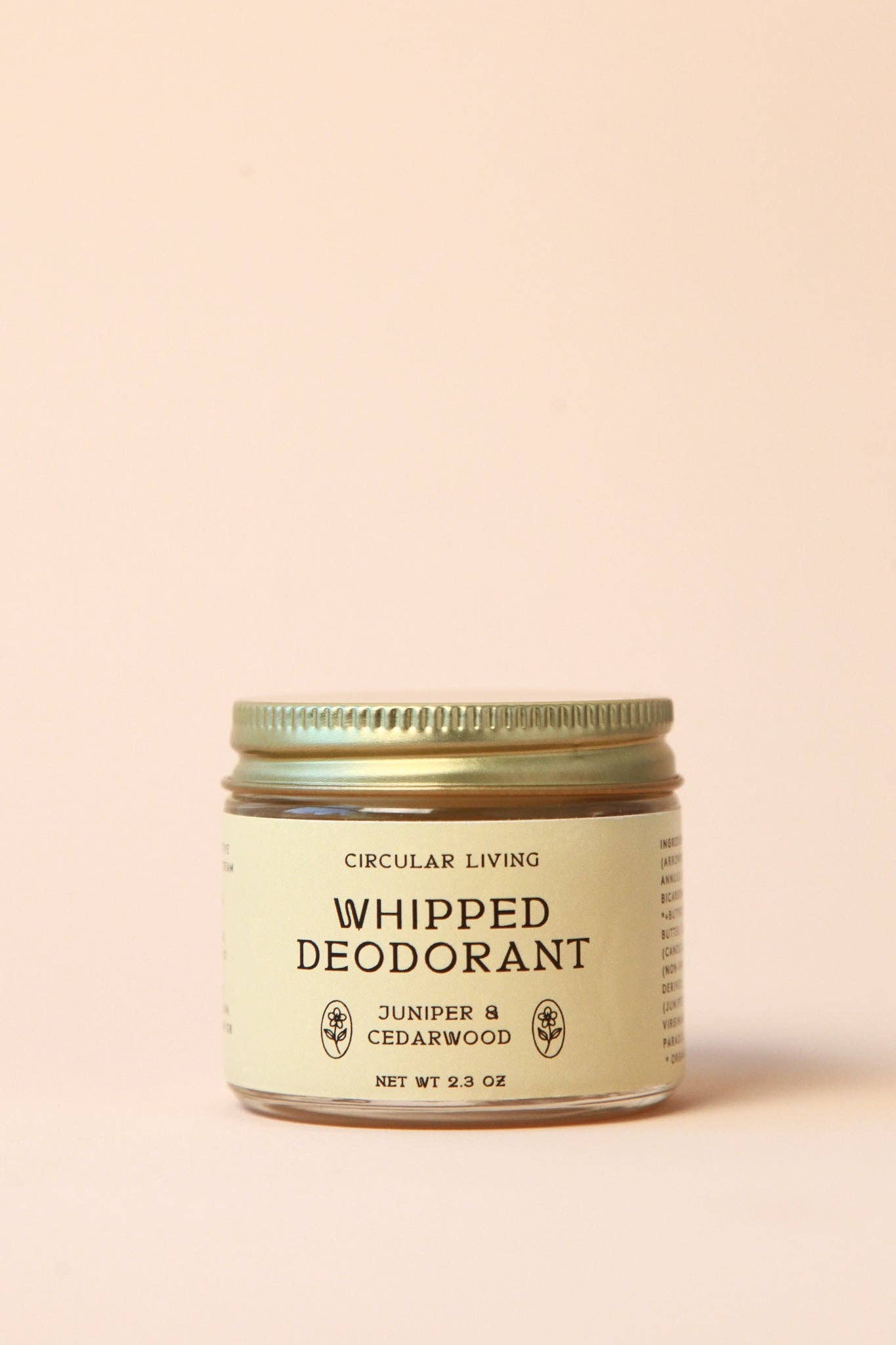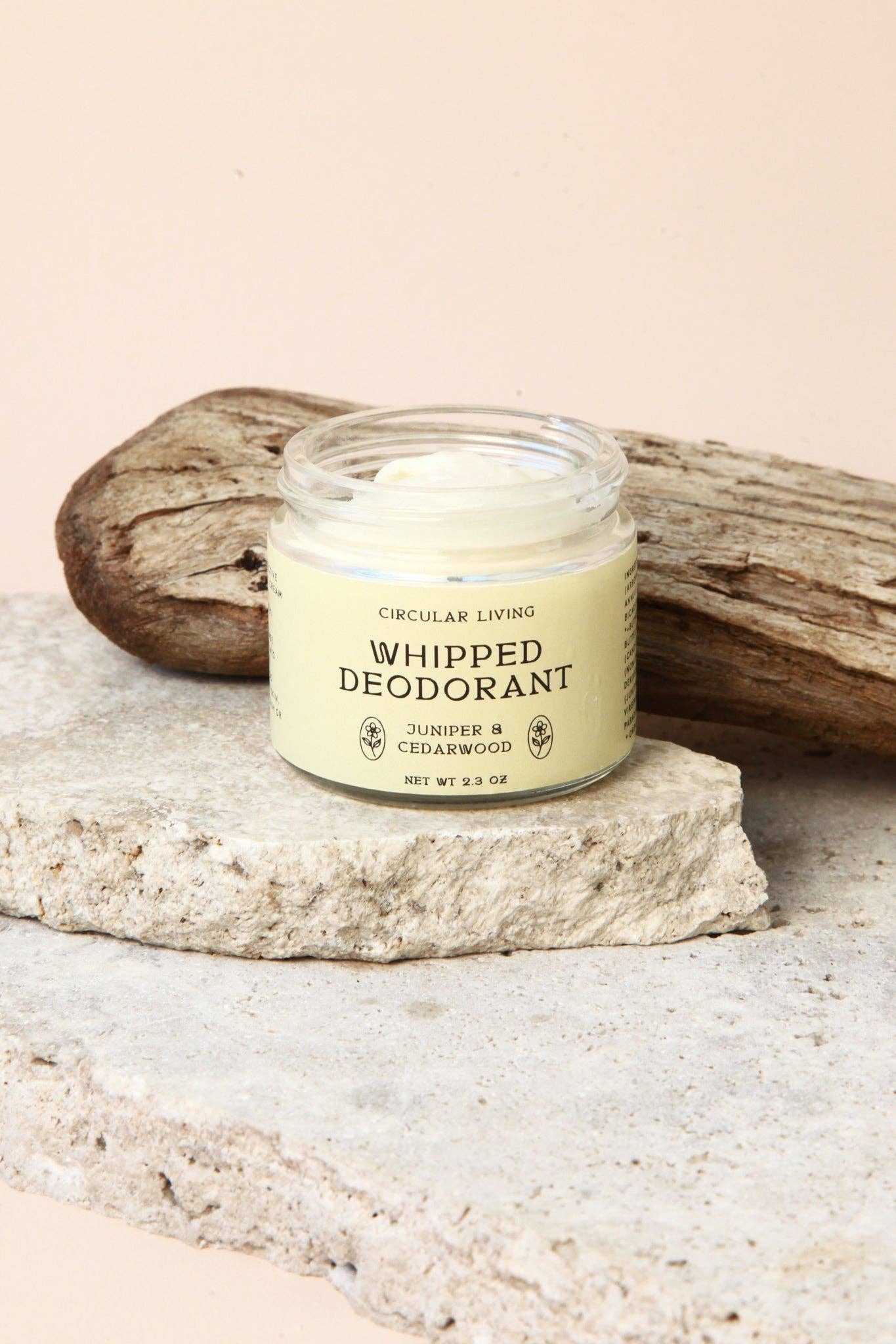 The Juniper & Cedarwood whipped deodorant features a woodsy, restoring, and cleansing blend of organic juniper, grapefruit, and cedarwood essential oil.